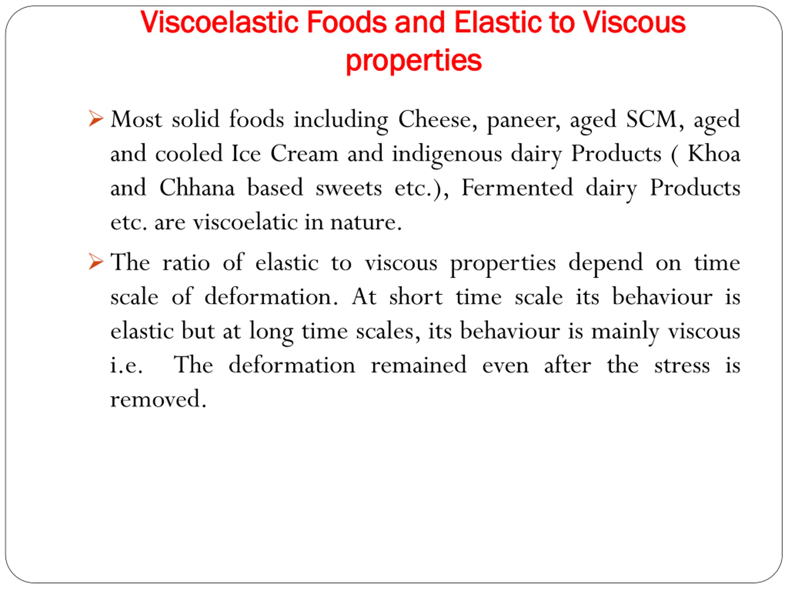 Viscoelastic Viscoelastic Foods and Elastic to Viscous Foods and Elastic to Viscous properties properties Most solid foods including Cheese, paneer, aged SCM, aged and cooled Ice Cream and indigenous dairy Products ( Khoa and Chhana based sweets etc.), Fermented dairy Products etc.are viscoelatic in nature. The ratio of elastic to viscous properties depend on time scale of deformation. At short time scale its behaviour is elastic but at long time scales, its behaviour is mainly viscous i.e. The deformation remained even after the stress is removed.
