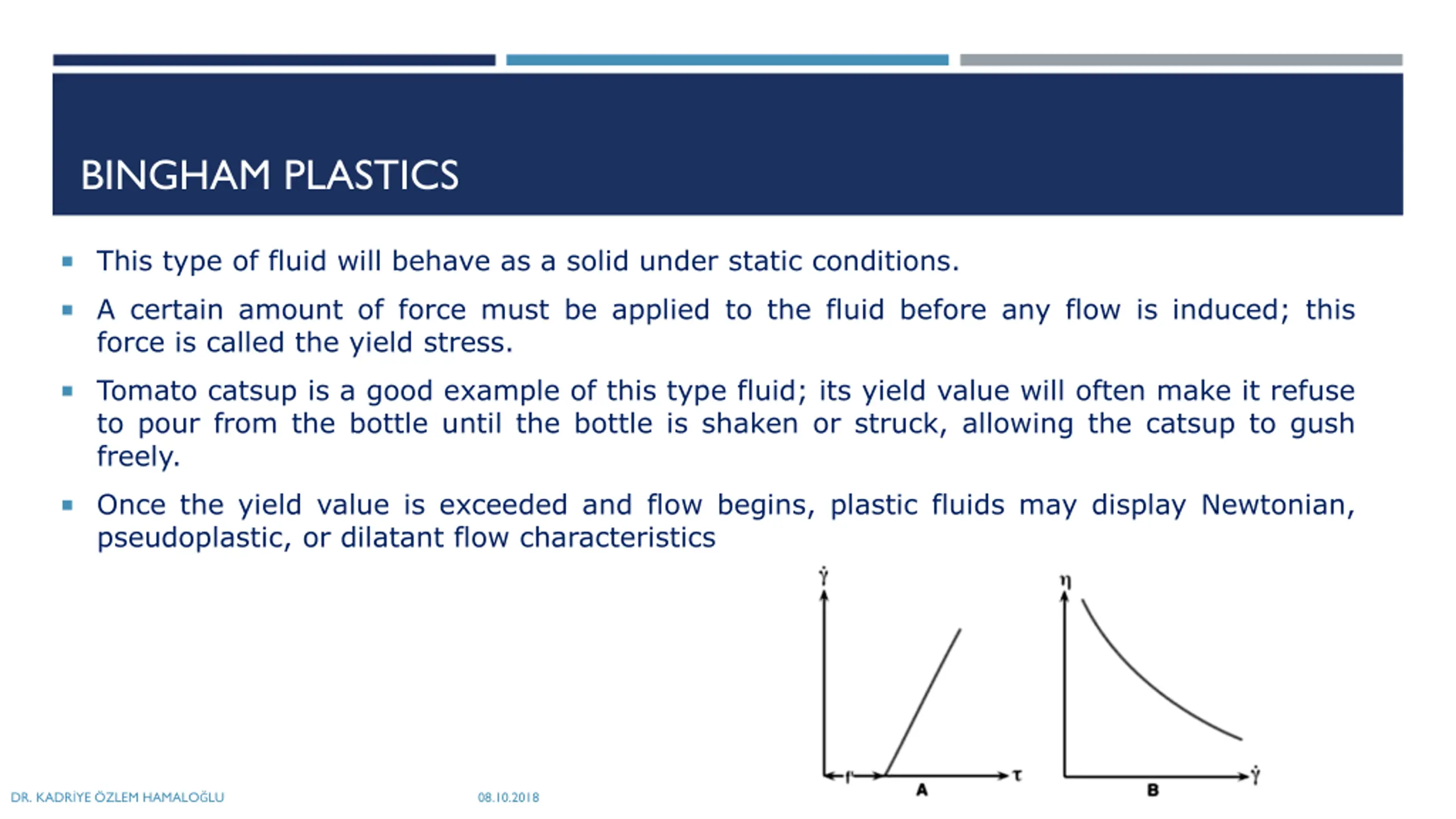 BINGHAM PLASTICS This type of fluid will behave as a solid under static conditions. A certain amount of force must be applied to the fluid before any flow is induced; this force is called the yield stress. Tomato catsup is a good example of this type fluid; its yield value will often make it refuse to pour from the bottle until the bottle is shaken or struck, allowing the catsup to gush freely. Once the yield value is exceeded and flow begins, plastic fluids may display Newtonian, pseudoplastic, or dilatant flow characteristics DR. KADR YE ZLEM HAMALO LU 08.10.2018