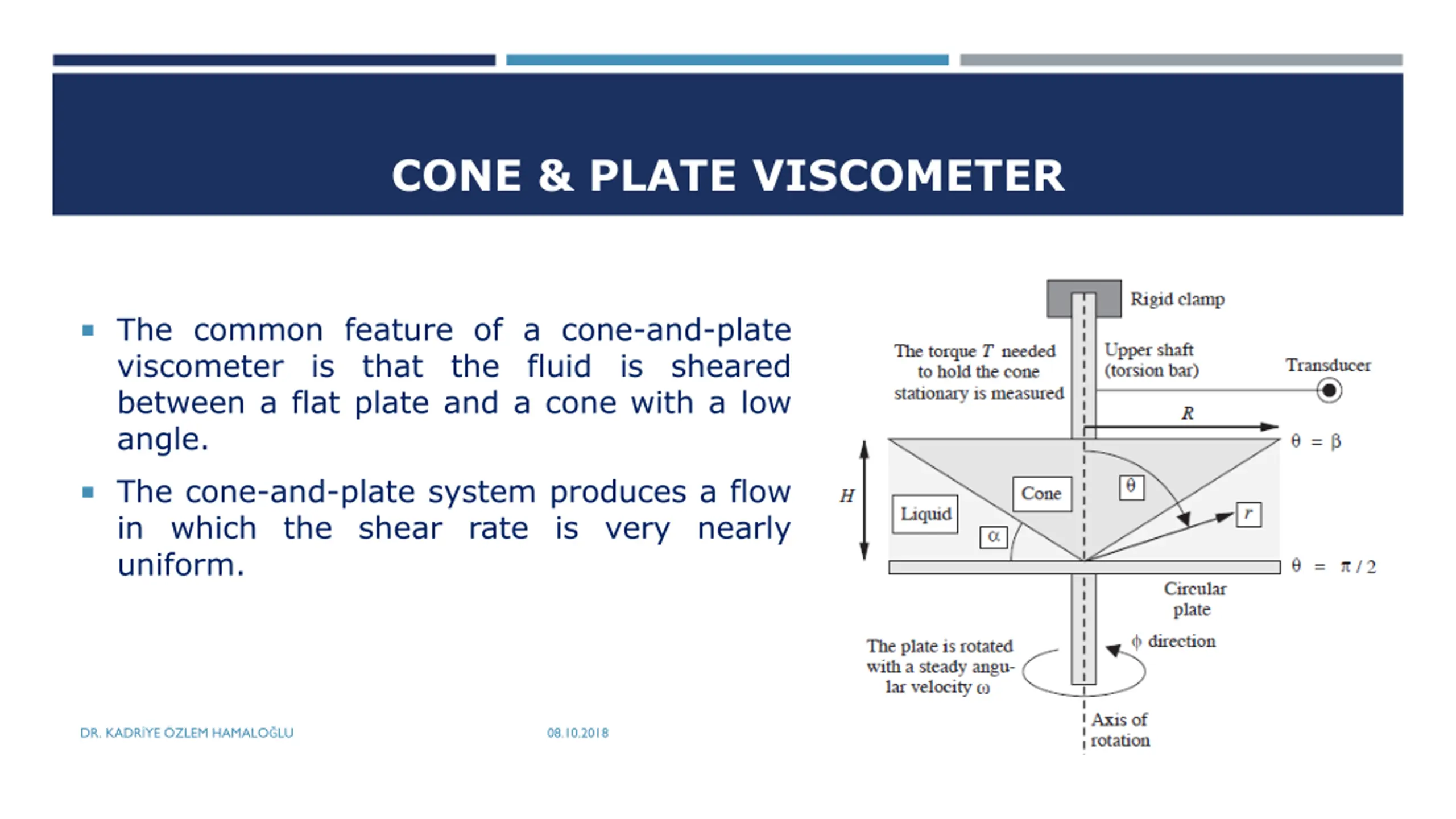 CONE & PLATE VISCOMETER The common feature of a cone-and-plate viscometer is that the fluid is sheared between a flat plate and a cone with a low angle. The cone-and-plate system produces a flow in which the shear rate is very nearly uniform. DR. KADR YE ZLEM HAMALO LU 08.10.2018