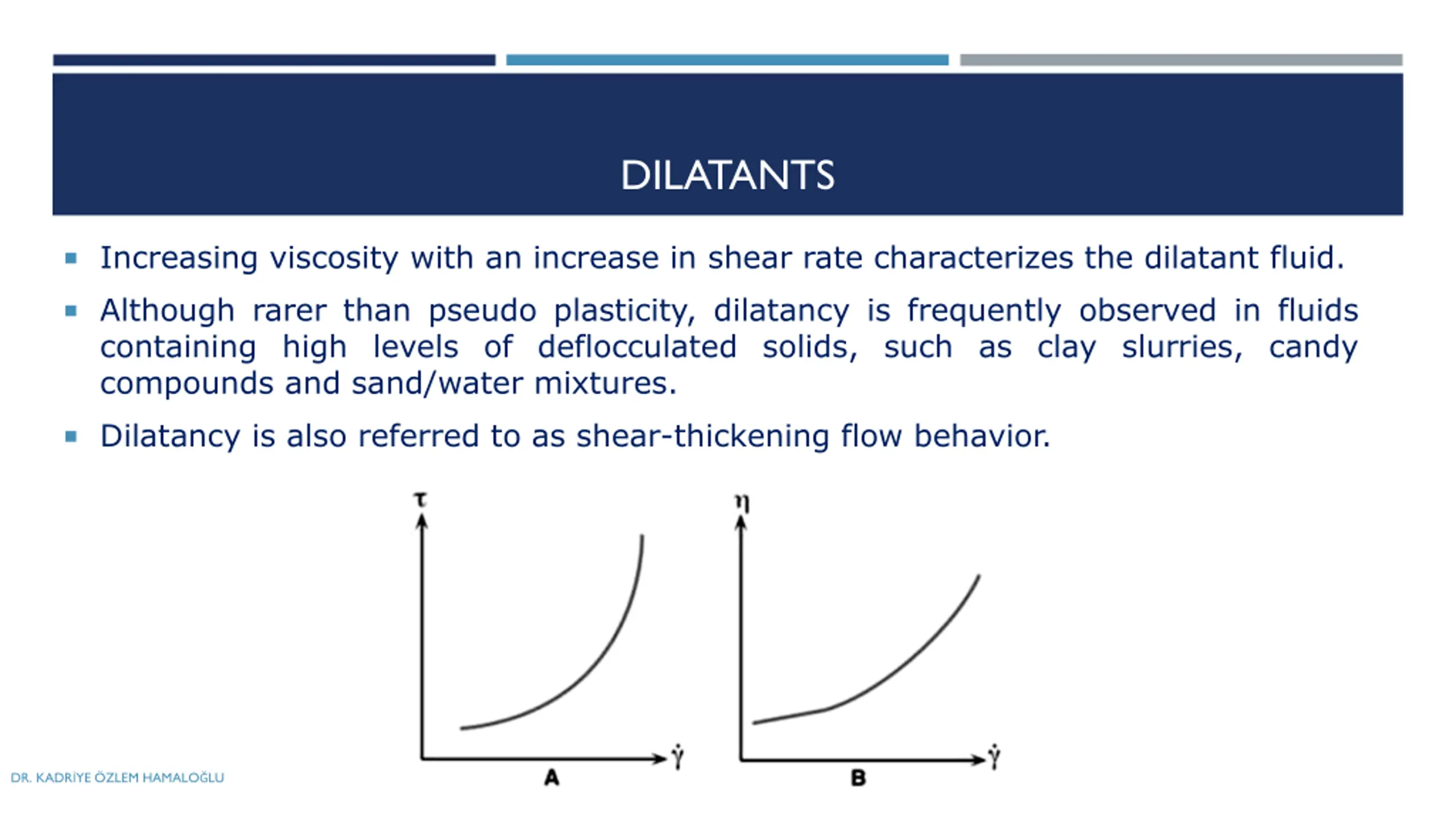 DILATANTS Increasing viscosity with an increase in shear rate characterizes the dilatant fluid. Although rarer than pseudo plasticity, dilatancy is frequently observed in fluids containing high levels of deflocculated solids, such as clay slurries, candy compounds and sand/water mixtures. Dilatancy is also referred to as shear-thickening flow behavior. DR. KADR YE ZLEM HAMALO LU 08.10.2018