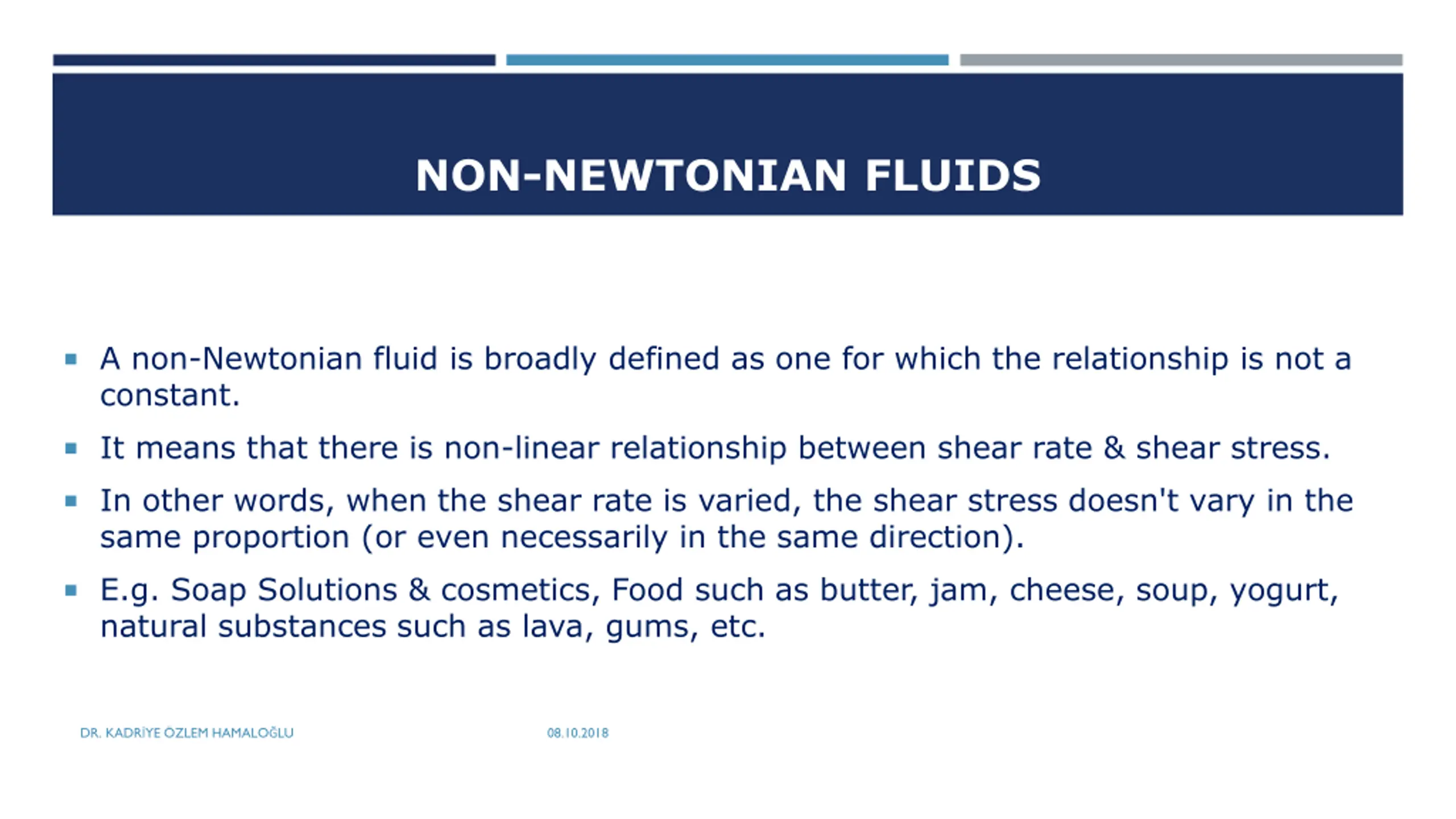 NON-NEWTONIAN FLUIDS A non-Newtonian fluid is broadly defined as one for which the relationship is not a constant. It means that there is non-linear relationship between shear rate & shear stress. In other words, when the shear rate is varied, the shear stress doesn't vary in the same proportion (or even necessarily in the same direction). E.g. Soap Solutions & cosmetics, Food such as butter, jam, cheese, soup, yogurt, natural substances such as lava, gums, etc. DR. KADR YE ZLEM HAMALO LU 08.10.2018