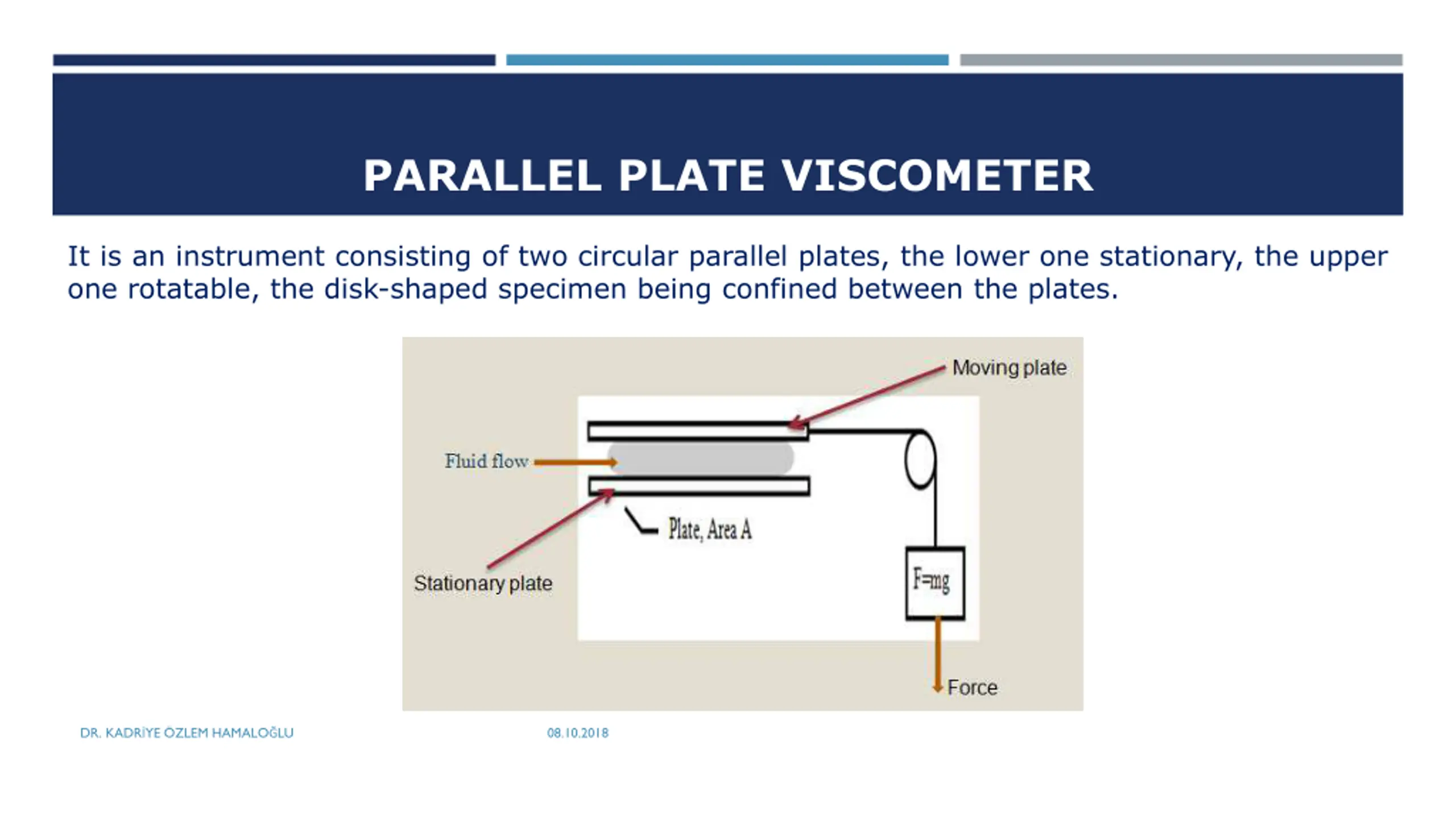 PARALLEL PLATE VISCOMETER It is an instrument consisting of two circular parallel plates, the lower one stationary, the upper one rotatable, the disk-shaped specimen being confined between the plates. DR. KADR YE ZLEM HAMALO LU 08.10.2018