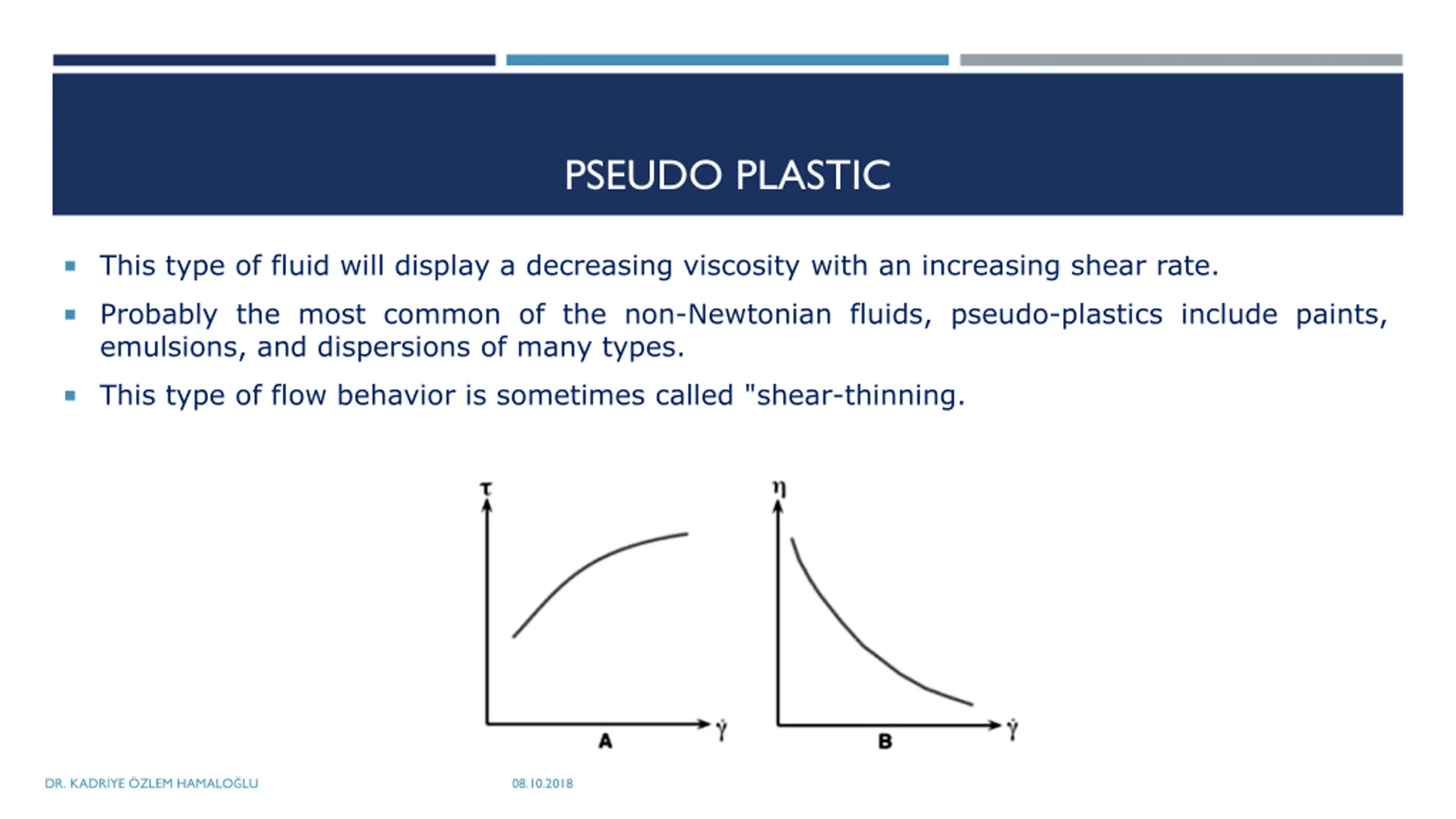 PSEUDO PLASTIC This type of fluid will display a decreasing viscosity with an increasing shear rate. Probably the most common of the non-Newtonian fluids, pseudo-plastics include paints, emulsions, and dispersions of many types. This type of flow behavior is sometimes called "shear-thinning. DR. KADR YE ZLEM HAMALO LU 08.10.2018