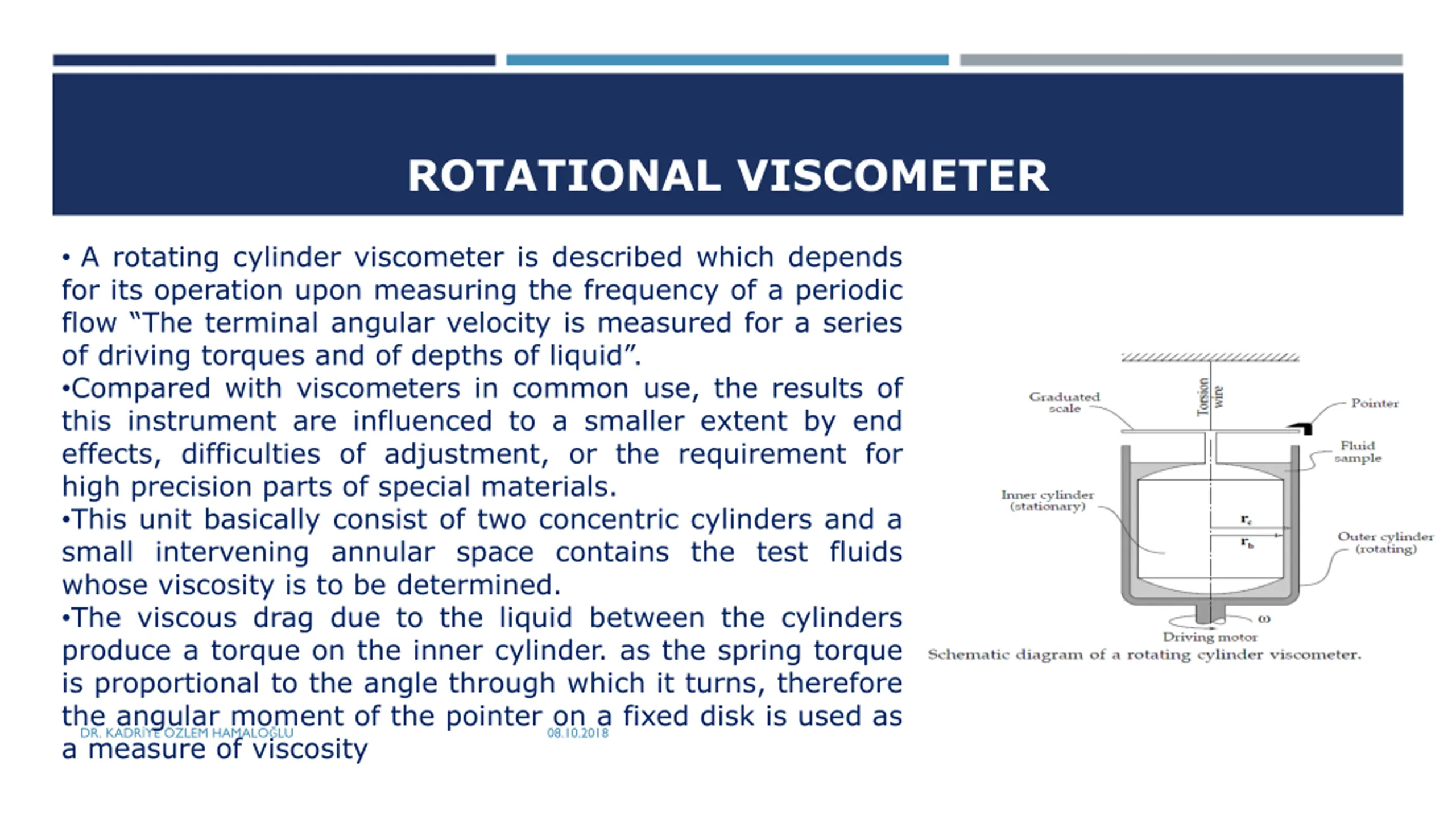 ROTATIONAL VISCOMETER A rotating cylinder viscometer is described which depends for its operation upon measuring the frequency of a periodic flow The terminal angular velocity is measured for a series of driving torques and of depths of liquid . Compared with viscometers in common use, the results of this instrument are influenced to a smaller extent by end effects, difficulties of adjustment, or the requirement for high precision parts of special materials. This unit basically consist of two concentric cylinders and a small intervening annular space contains the test fluids whose viscosity is to be determined. The viscous drag due to the liquid between the cylinders produce a torque on the inner cylinder. as the spring torque is proportional to the angle through which it turns, therefore the angular moment of the pointer on a fixed disk is used as DR. KADR YE ZLEM HAMALO LU a measure of viscosity 08.10.2018