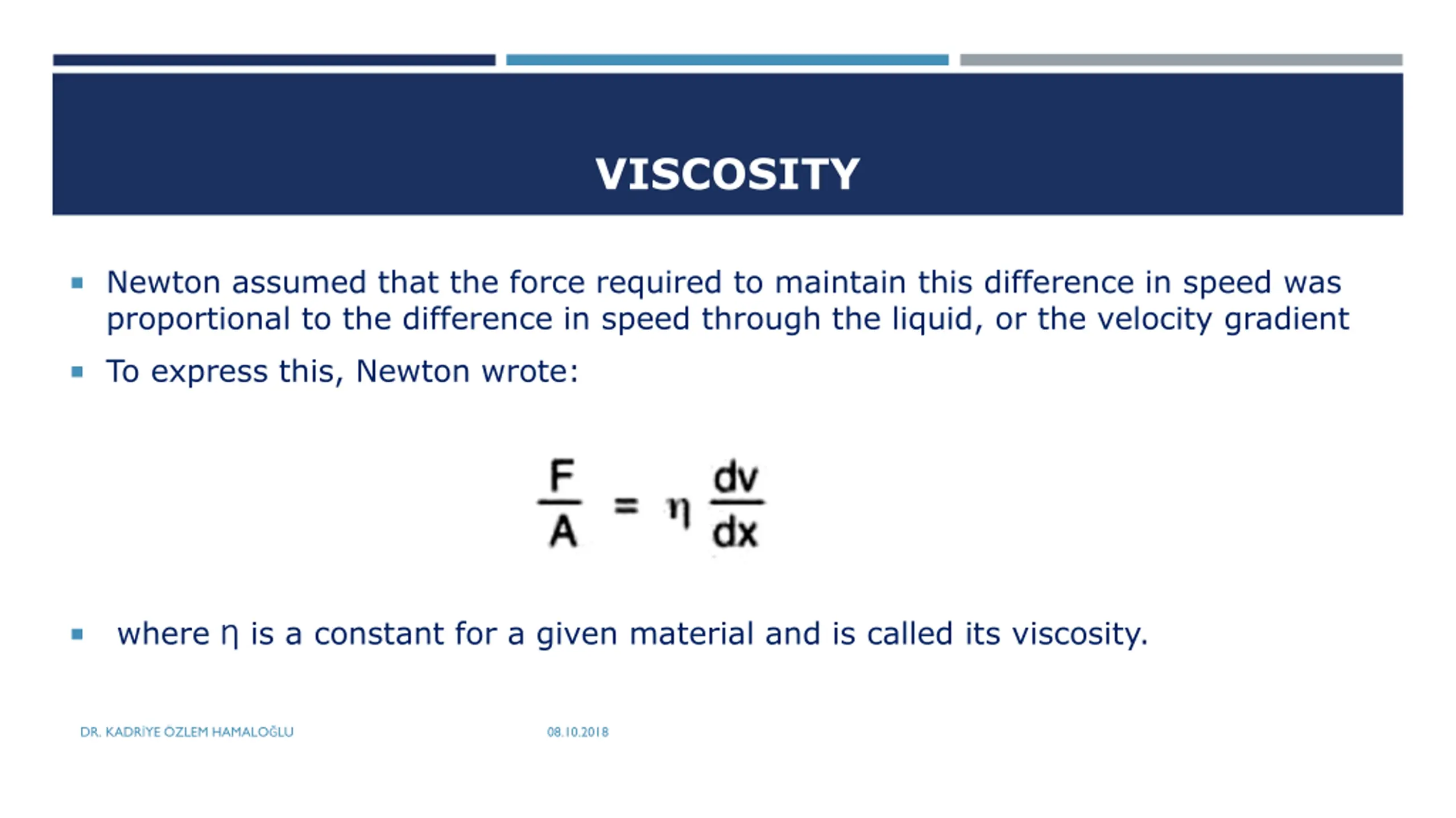 VISCOSITY Newton assumed that the force required to maintain this difference in speed was proportional to the difference in speed through the liquid, or the velocity gradient To express this, Newton wrote: where is a constant for a given material and is called its viscosity. DR. KADR YE ZLEM HAMALO LU 08.10.2018