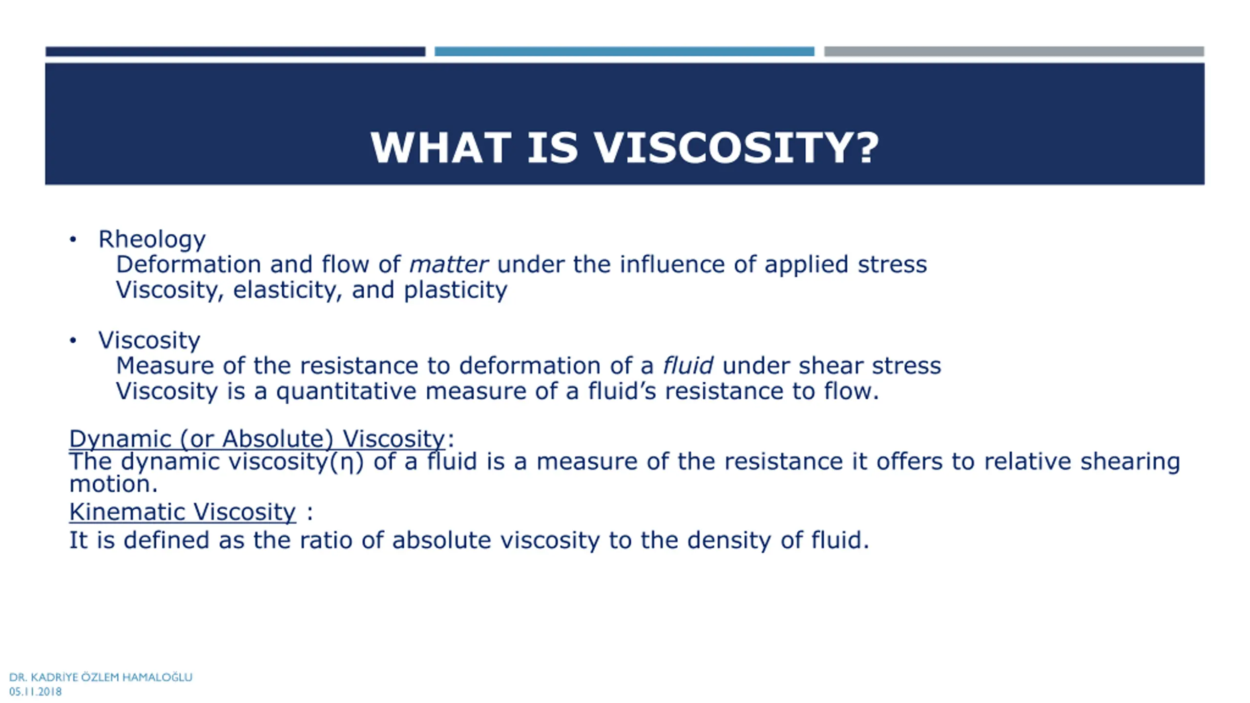 WHAT IS VISCOSITY? Rheology Deformation and flow of matter under the influence of applied stress Viscosity, elasticity, and plasticity Viscosity Measure of the resistance to deformation of a fluid under shear stress Viscosity is a quantitative measure of a fluid s resistance to flow. Dynamic (or Absolute) Viscosity: The dynamic viscosity( ) of a fluid is a measure of the resistance it offers to relative shearing motion. Kinematic Viscosity : It is defined as the ratio of absolute viscosity to the density of fluid. DR. KADR YE ZLEM HAMALO LU 05.11.2018