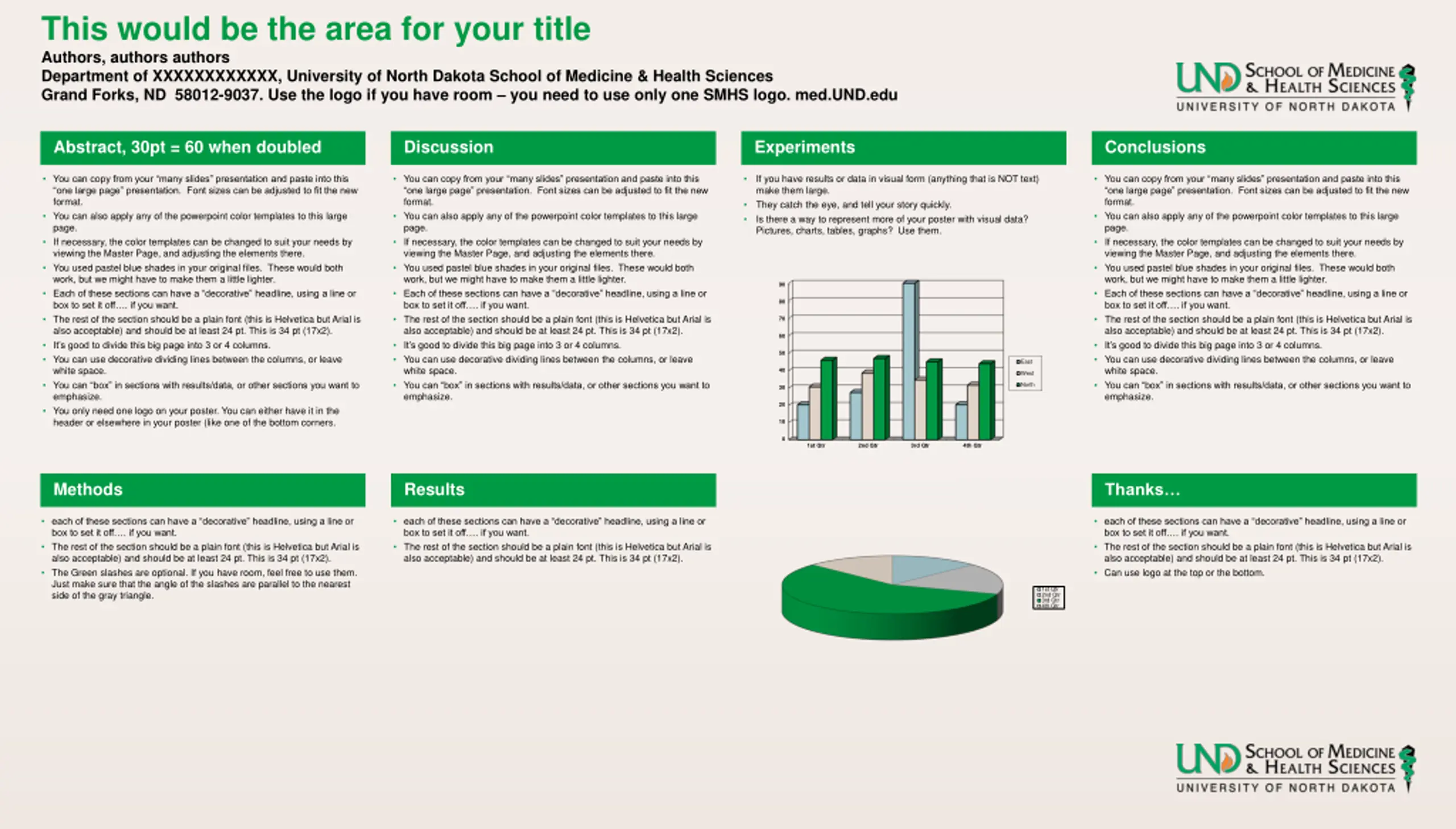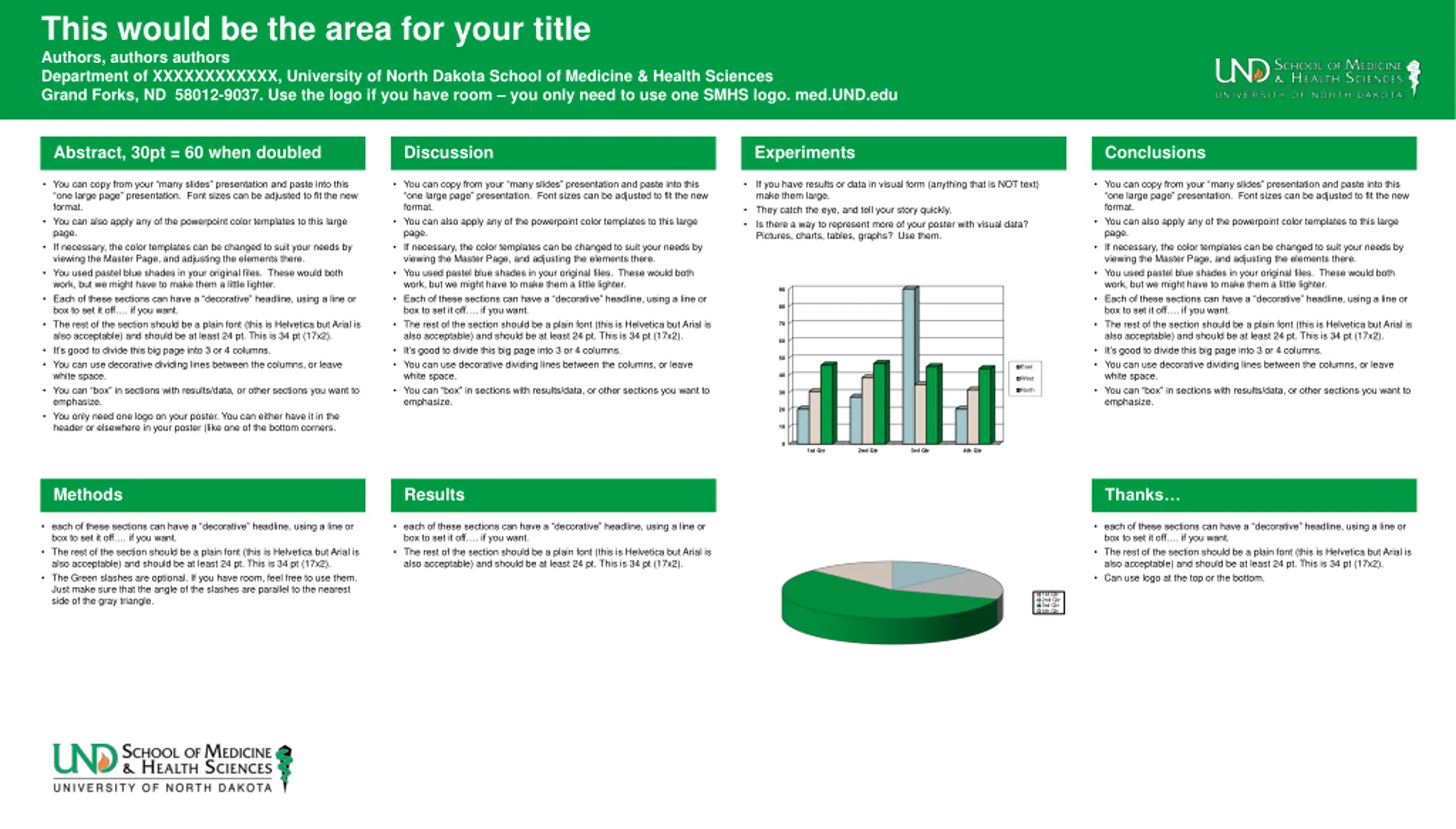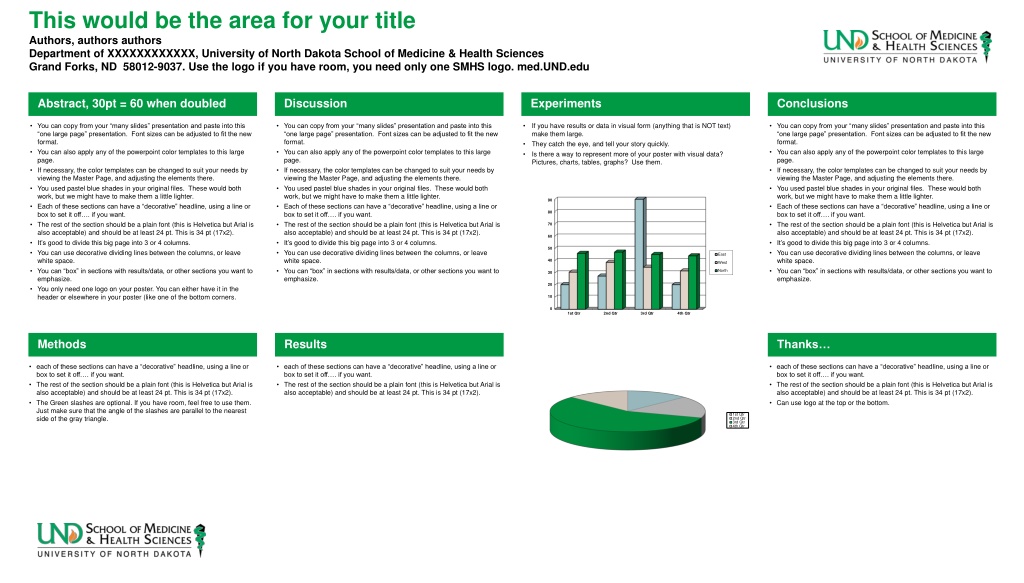 This would be the area for your title Authors, authors authors Department of XXXXXXXXXXXX, University of North Dakota School of Medicine & Health Sciences Grand Forks, ND 58012-9037. Use the logo if you have room you only need to use one SMHS logo. med.UND.edu Abstract, 30pt = 60 when doubled Discussion Experiments Conclusions If you have results or data in visual form (anything that is NOT text) make them large. They catch the eye, and tell your story quickly. Is there a way to represent more of your poster with visual data? Pictures, charts, tables, graphs? Use them. You can copy from your many slides presentation and paste into this one large page presentation. Font sizes can be adjusted to fit the new format. You can also apply any of the powerpoint color templates to this large page. If necessary, the color templates can be changed to suit your needs by viewing the Master Page, and adjusting the elements there. You used pastel blue shades in your original files. These would both work, but we might have to make them a little lighter. Each of these sections can have a decorative headline, using a line or box to set it off . if you want. The rest of the section should be a plain font (this is Helvetica but Arial is also acceptable) and should be at least 24 pt. This is 34 pt (17x2). It s good to divide this big page into 3 or 4 columns. You can use decorative dividing lines between the columns, or leave white space. You can box in sections with results/data, or other sections you want to emphasize. You only need one logo on your poster. You can either have it in the header or elsewhere in your poster (like one of the bottom corners. You can copy from your many slides presentation and paste into this one large page presentation. Font sizes can be adjusted to fit the new format. You can also apply any of the powerpoint color templates to this large page. If necessary, the color templates can be changed to suit your needs by viewing the Master Page, and adjusting the elements there. You used pastel blue shades in your original files. These would both work, but we might have to make them a little lighter. Each of these sections can have a decorative headline, using a line or box to set it off . if you want. The rest of the section should be a plain font (this is Helvetica but Arial is also acceptable) and should be at least 24 pt. This is 34 pt (17x2). It s good to divide this big page into 3 or 4 columns. You can use decorative dividing lines between the columns, or leave white space. You can box in sections with results/data, or other sections you want to emphasize. You can copy from your many slides presentation and paste into this one large page presentation. Font sizes can be adjusted to fit the new format. You can also apply any of the powerpoint color templates to this large page. If necessary, the color templates can be changed to suit your needs by viewing the Master Page, and adjusting the elements there. You used pastel blue shades in your original files. These would both work, but we might have to make them a little lighter. Each of these sections can have a decorative headline, using a line or box to set it off . if you want. The rest of the section should be a plain font (this is Helvetica but Arial is also acceptable) and should be at least 24 pt. This is 34 pt (17x2). It s good to divide this big page into 3 or 4 columns. You can use decorative dividing lines between the columns, or leave white space. You can box in sections with results/data, or other sections you want to emphasize. 90 80 70 60 50 East 40 West North 30 20 10 0 1st Qtr 2nd Qtr 3rd Qtr 4th Qtr Methods Results Thanks each of these sections can have a decorative headline, using a line or box to set it off . if you want. The rest of the section should be a plain font (this is Helvetica but Arial is also acceptable) and should be at least 24 pt. This is 34 pt (17x2). The Green slashes are optional. If you have room, feel free to use them. Just make sure that the angle of the slashes are parallel to the nearest side of the gray triangle. each of these sections can have a decorative headline, using a line or box to set it off . if you want. The rest of the section should be a plain font (this is Helvetica but Arial is also acceptable) and should be at least 24 pt. This is 34 pt (17x2). each of these sections can have a decorative headline, using a line or box to set it off . if you want. The rest of the section should be a plain font (this is Helvetica but Arial is also acceptable) and should be at least 24 pt. This is 34 pt (17x2). Can use logo at the top or the bottom. 1st Qtr 2nd Qtr 3rd Qtr 4th Qtr