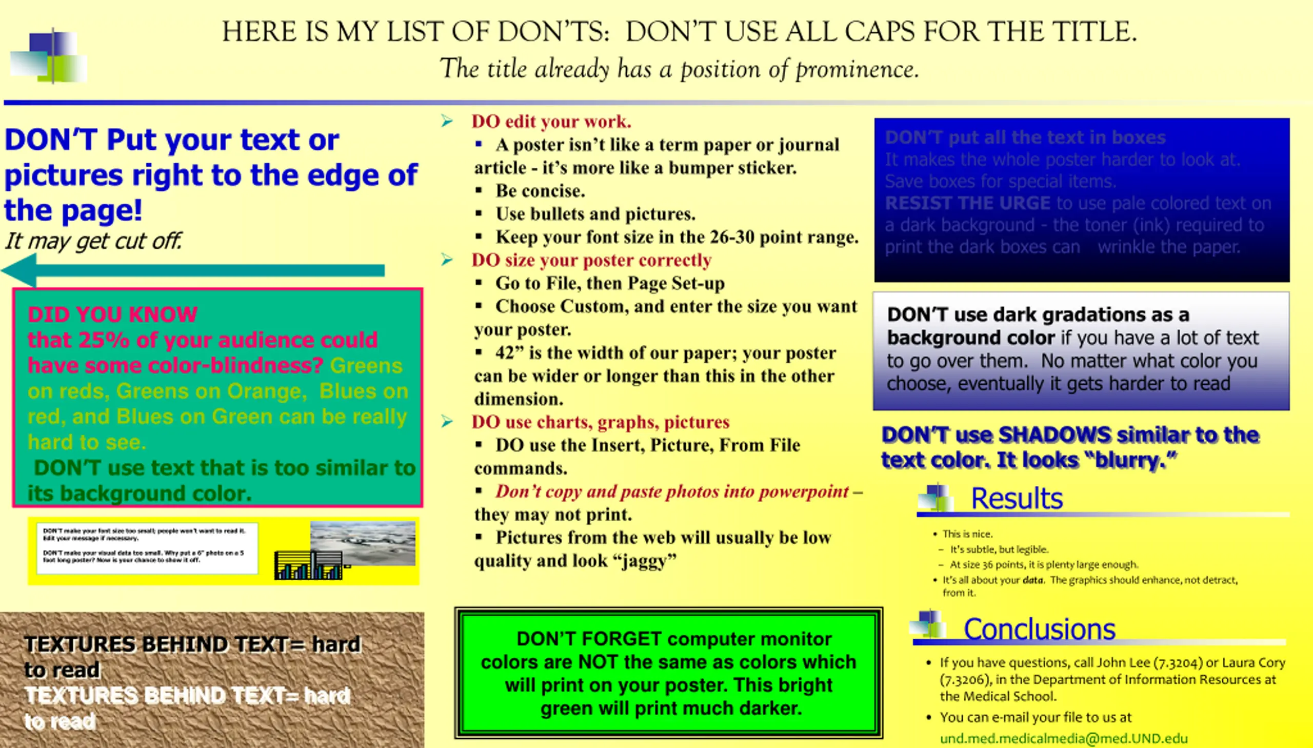 HERE IS MY LIST OF DONTS: DONT USE ALL CAPS FOR THE TITLE. The title already has a position of prominence. DO edit your work. A poster isn t like a term paper or journal article - it s more like a bumper sticker. Be concise. Use bullets and pictures. Keep your font size in the 26-30 point range. DO size your poster correctly Go to File, then Page Set-up Choose Custom, and enter the size you want your poster. 42 is the width of our paper; your poster can be wider or longer than this in the other dimension. DO use charts, graphs, pictures DO use the Insert, Picture, From File commands. Don t copy and paste photos into powerpoint they may not print. Pictures from the web will usually be low quality and look jaggy DON T Put your text or pictures right to the edge of the page! It may get cut off. DON T put all the text in boxes It makes the whole poster harder to look at. Save boxes for special items. RESIST THE URGE to use pale colored text on a dark background - the toner (ink) required to print the dark boxes can wrinkle the paper. DID YOU KNOW that 25% of your audience could have some color-blindness? Greens on reds, Greens on Orange, Blues on red, and Blues on Green can be really hard to see. DON T use text that is too similar to its background color. DON T use dark gradations as a background color if you have a lot of text to go over them. No matter what color you choose, eventually it gets harder to read DON T use SHADOWS similar to the text color. It looks blurry. Results DON T make your font size too small; people won t want to read it. Edit your message if necessary. This is nice. It s subtle, but legible. At size 36 points, it is plenty large enough. It s all about your data. The graphics should enhance, not detract, from it. Conclusions DON T make your visual data too small. Why put a 6 photo on a 5 foot long poster? Now is your chance to show it off. 9 0 8 0 7 0 6 0 5 0 Ea st We st Nor t h 4 0 3 0 2 0 10 0 1st Qt r 2 nd Qt r 3 r d Qt r 4 t h Qt r DON T FORGET computer monitor colors are NOT the same as colors which will print on your poster. This bright green will print much darker. TEXTURES BEHIND TEXT= hard to read TEXTURES BEHIND TEXT= hard to read If you have questions, call John Lee (7.3204) or Laura Cory (7.3206), in the Department of Information Resources at the Medical School. You can e-mail your file to us at und.med.medicalmedia@med.UND.edu