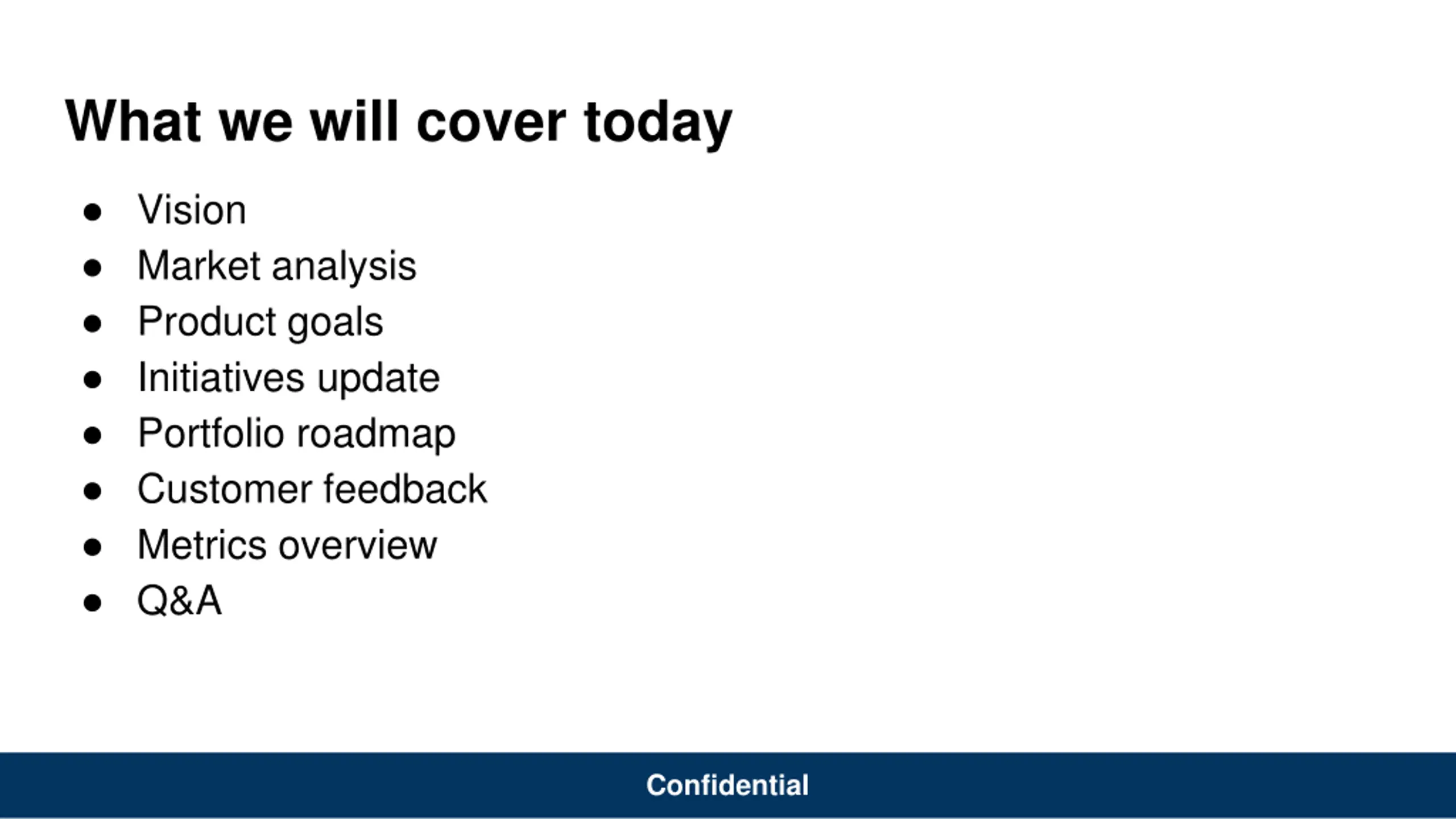 What we will cover today Vision Market analysis Product goals Initiatives update Portfolio roadmap Customer feedback Metrics overview Q&A Confidential