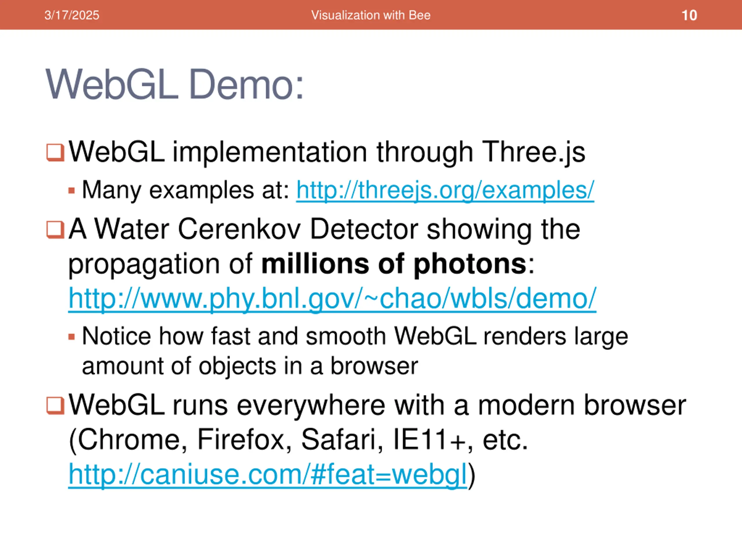 10 3/17/2025 Visualization with Bee WebGL Demo: WebGL implementation through Three.js Many examples at: http://threejs.org/examples/ A Water Cerenkov Detector showing the propagation of millions of photons: http://www.phy.bnl.gov/~chao/wbls/demo/ Notice how fast and smooth WebGL renders large amount of objects in a browser WebGL runs everywhere with a modern browser (Chrome, Firefox, Safari, IE11+, etc. http://caniuse.com/#feat=webgl)