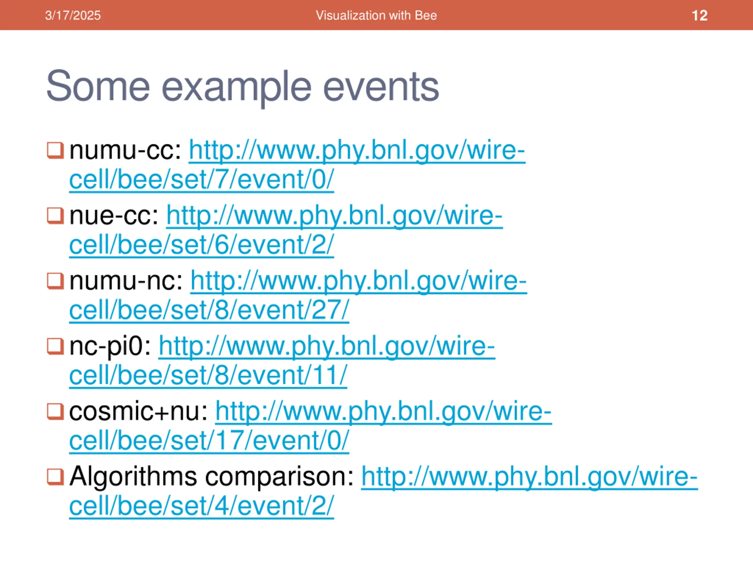 11 3/17/2025 Visualization with Bee Bee Demo http://www.phy.bnl.gov/wire-cell/bee/ Basic Operations Move around 2-D projections Compare different algorithms Compare with MC truth Sliced mode Hotkeys Event sets Upload your own event sets Doc: http://bnlif.github.io/wire-cell-docs/viz/bee/