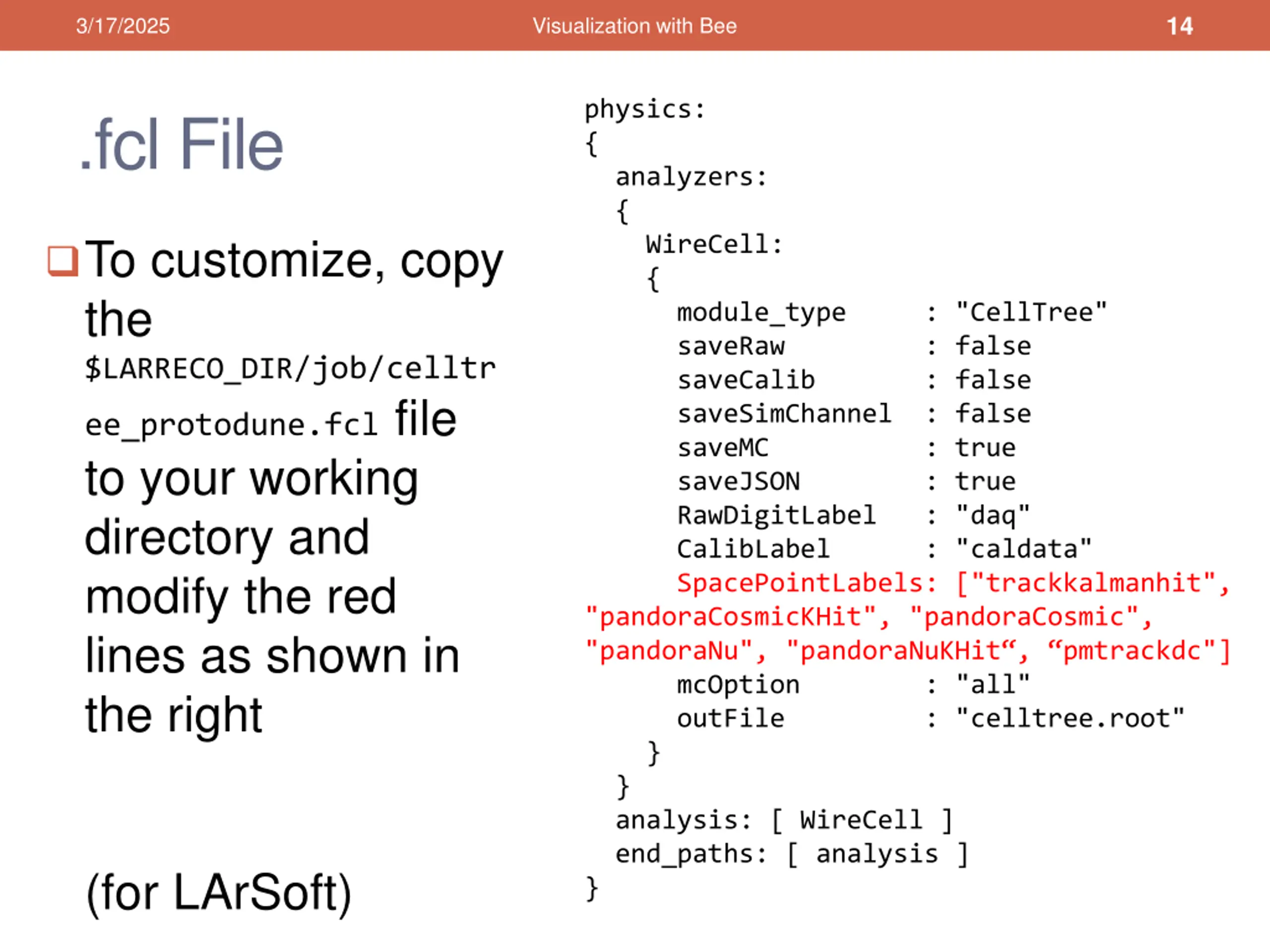 14 3/17/2025 Visualization with Bee physics: { analyzers: { WireCell: { module_type : "CellTree" saveRaw : false saveCalib : false saveSimChannel : false saveMC : true saveJSON : true RawDigitLabel : "daq" CalibLabel : "caldata" SpacePointLabels: ["trackkalmanhit", "pandoraCosmicKHit", "pandoraCosmic", "pandoraNu", "pandoraNuKHit , pmtrackdc"] mcOption : "all" outFile : "celltree.root" } } analysis: [ WireCell ] end_paths: [ analysis ] } .fcl File To customize, copy the $LARRECO_DIR/job/celltr ee_protodune.fcl file to your working directory and modify the red lines as shown in the right (for LArSoft)