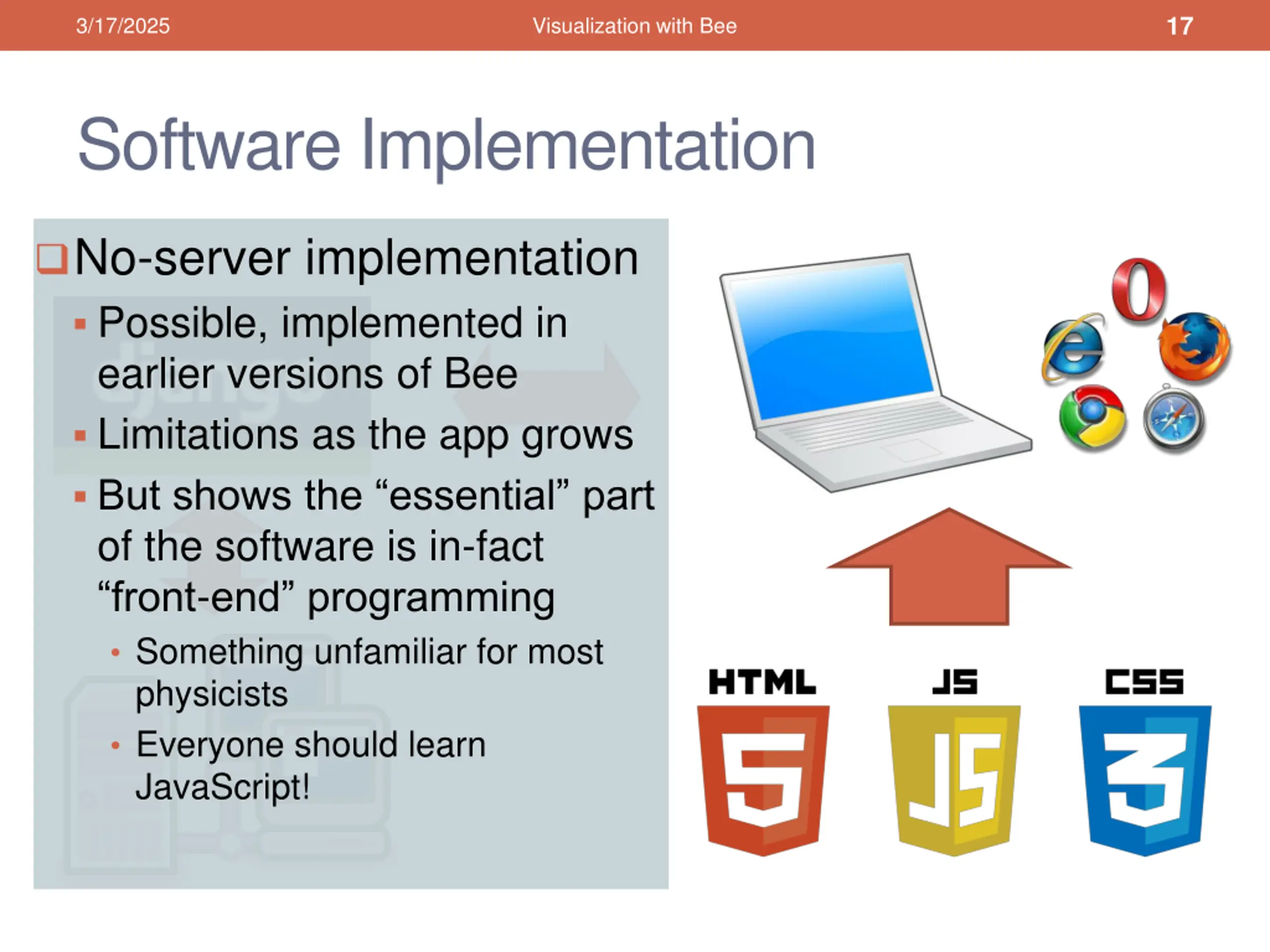 17 3/17/2025 Visualization with Bee Software Implementation No-server implementation Possible, implemented in earlier versions of Bee Limitations as the app grows But shows the essential part of the software is in-fact front-end programming Something unfamiliar for most physicists Everyone should learn JavaScript!