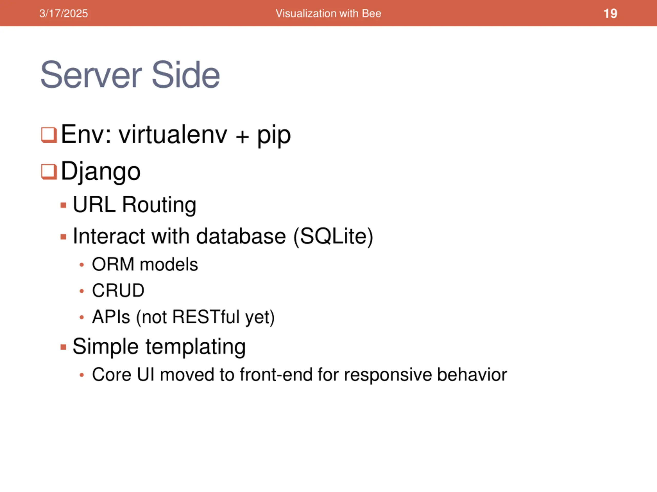 19 3/17/2025 Visualization with Bee Server Side Env: virtualenv + pip Django URL Routing Interact with database (SQLite) ORM models CRUD APIs (not RESTful yet) Simple templating Core UI moved to front-end for responsive behavior