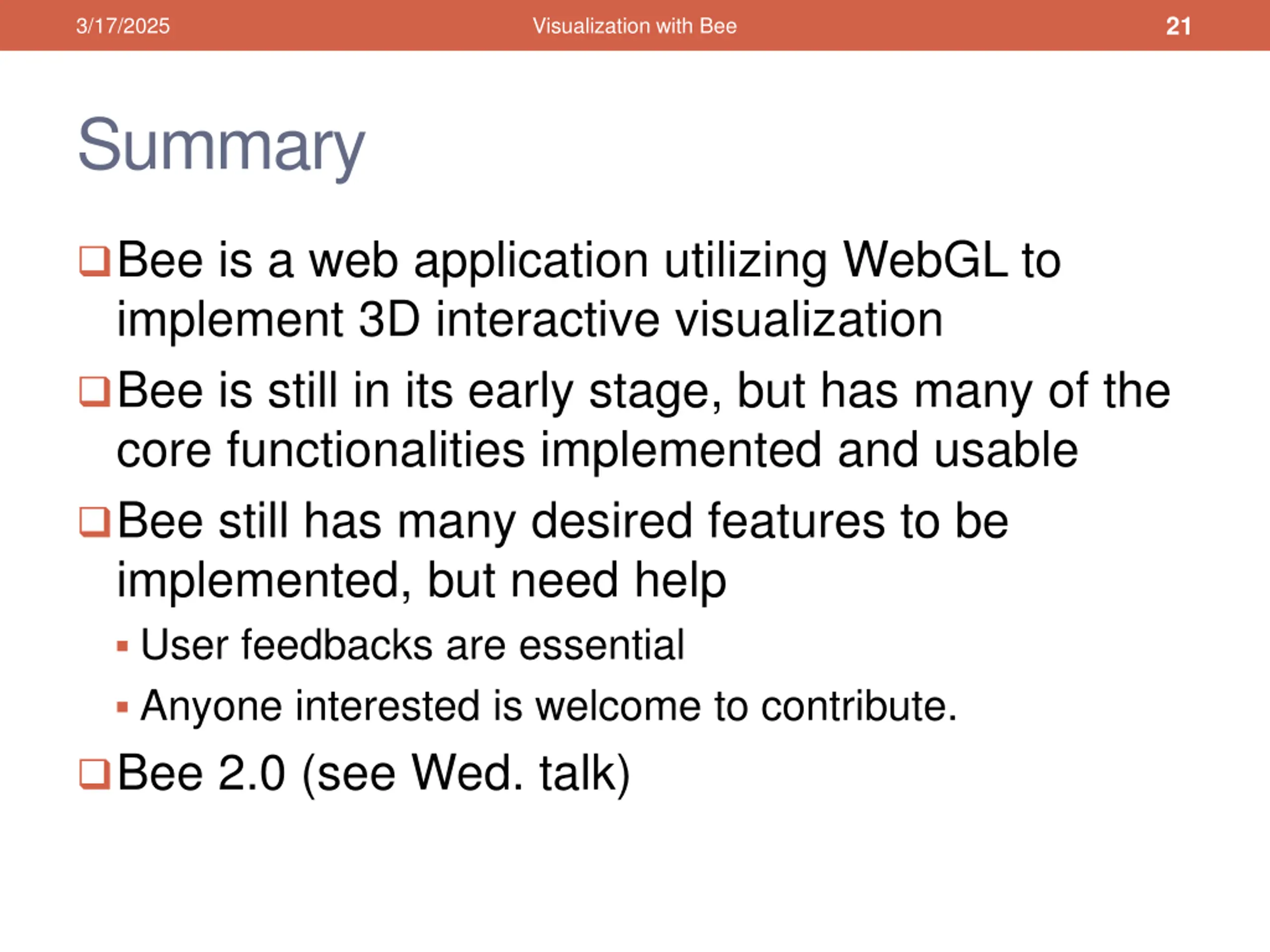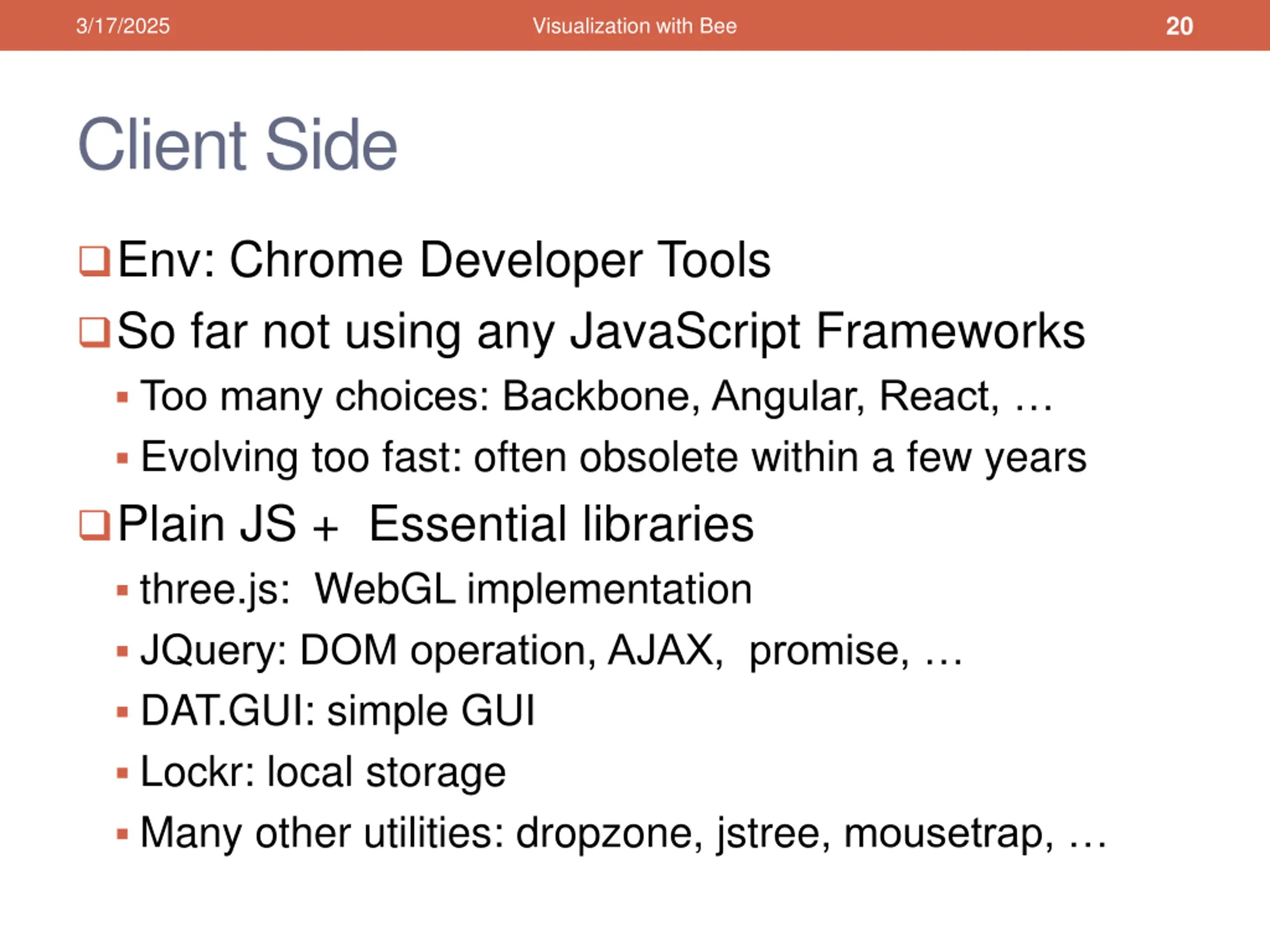 20 3/17/2025 Visualization with Bee Client Side Env: Chrome Developer Tools So far not using any JavaScript Frameworks Too many choices: Backbone, Angular, React, Evolving too fast: often obsolete within a few years Plain JS + Essential libraries three.js: WebGL implementation JQuery: DOM operation, AJAX, promise, DAT.GUI: simple GUI Lockr: local storage Many other utilities: dropzone, jstree, mousetrap,