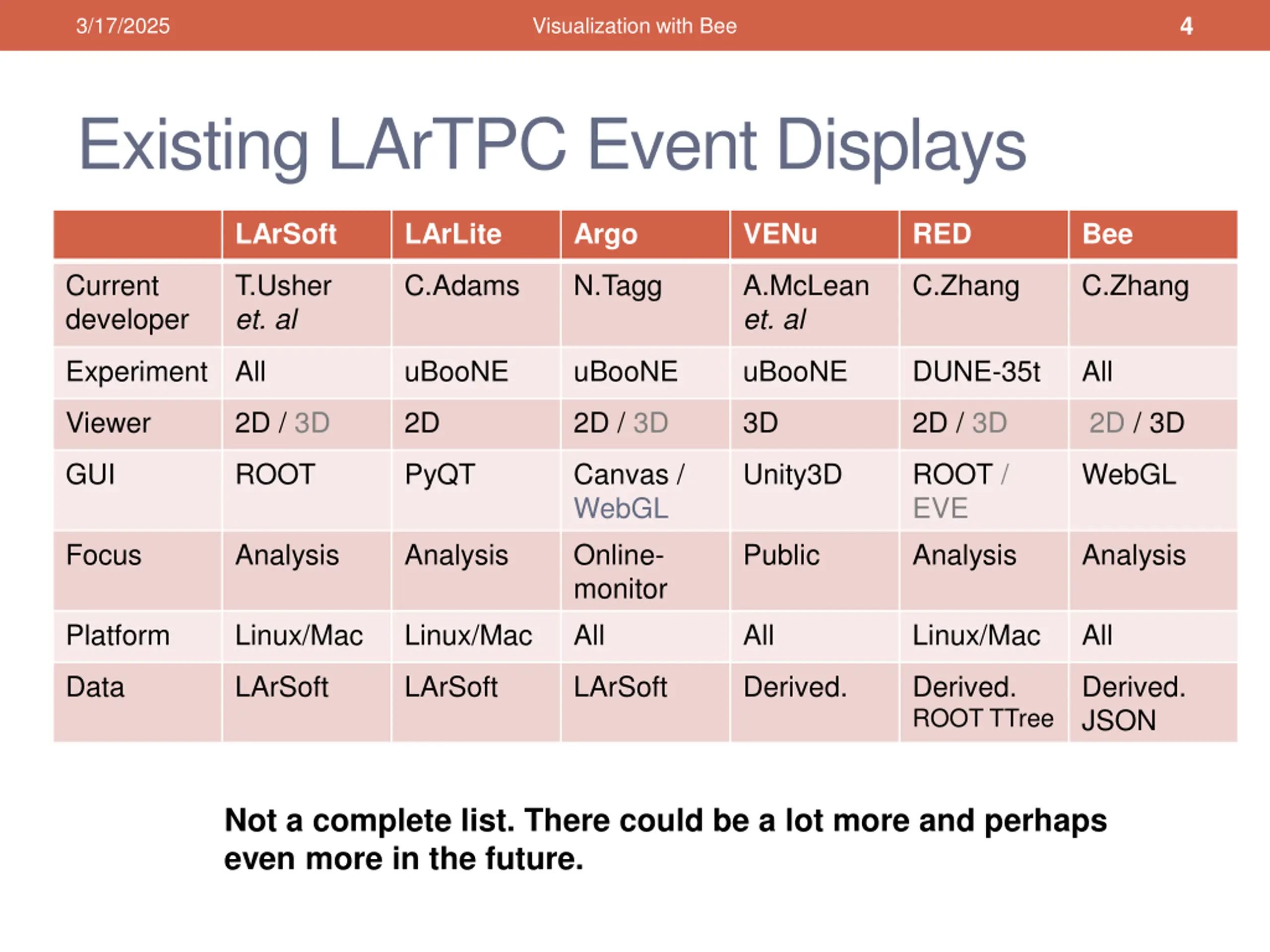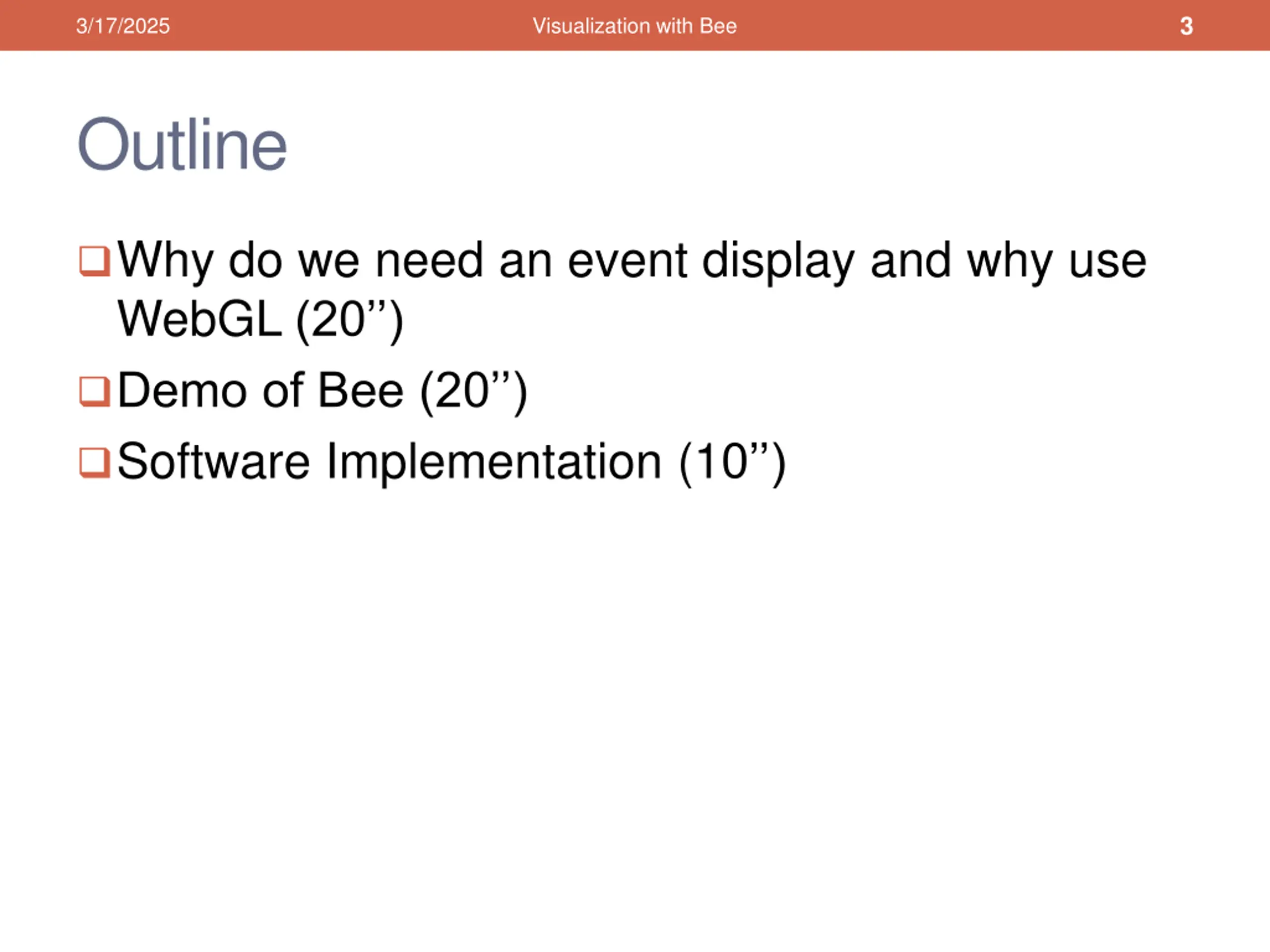 3 3/17/2025 Visualization with Bee Outline Why do we need an event display and why use WebGL (20 ) Demo of Bee (20 ) Software Implementation (10 )
