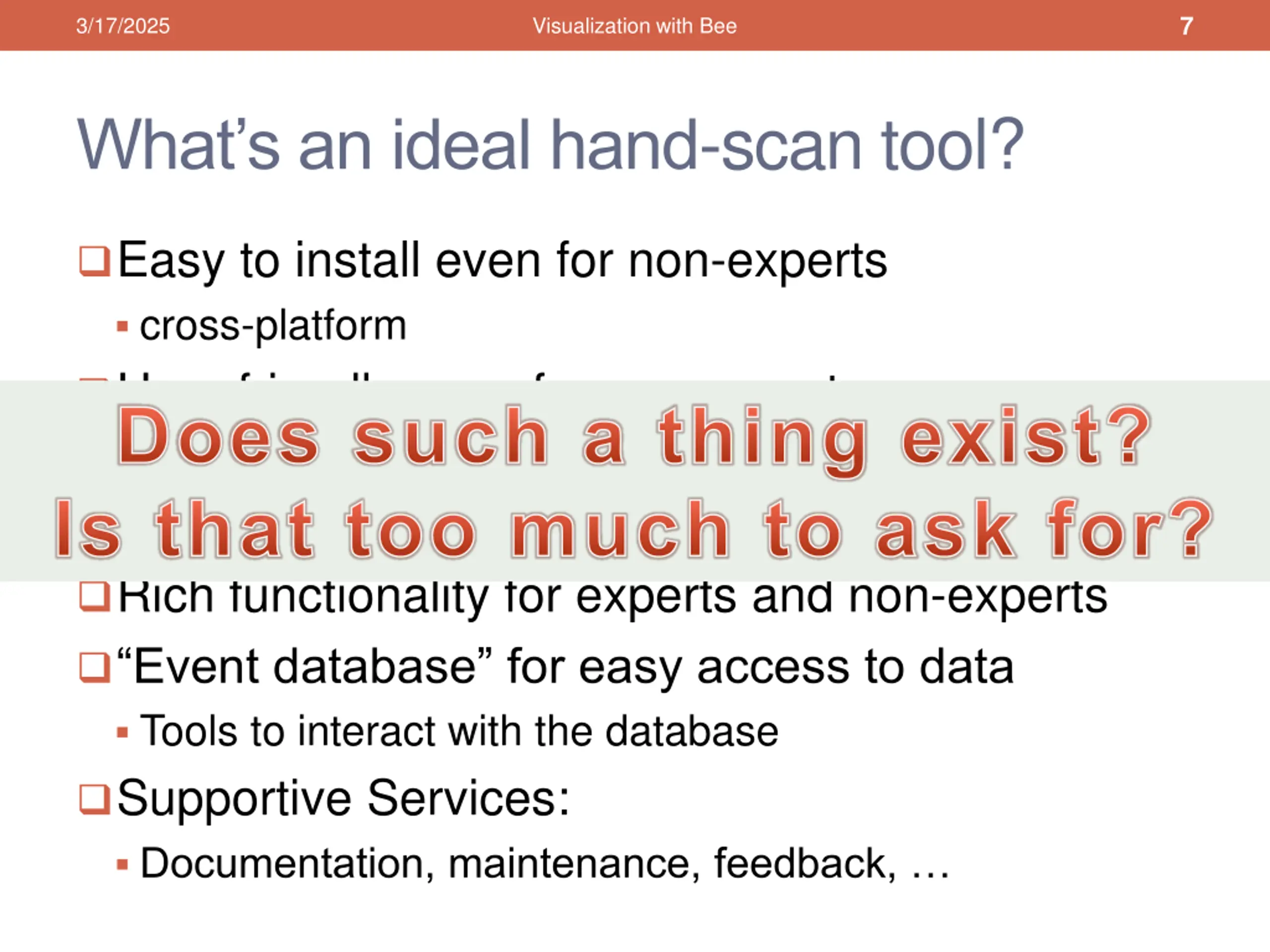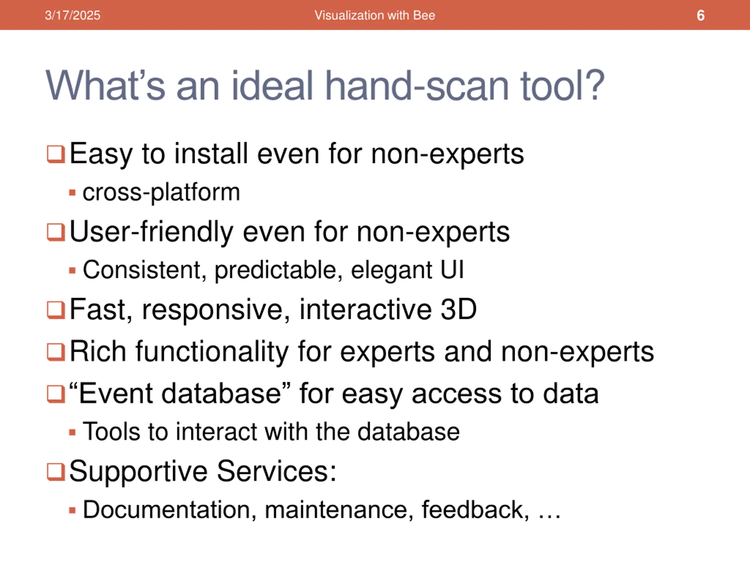7 3/17/2025 Visualization with Bee What s an ideal hand-scan tool? Easy to install even for non-experts cross-platform User-friendly even for non-experts Consistent and elegant UI Fast and Responsive Rich functionality for experts and non-experts Event database for easy access to data Tools to interact with the database Supportive Services: Documentation, maintenance, feedback, Does such a thing exist? Is that too much to ask for?
