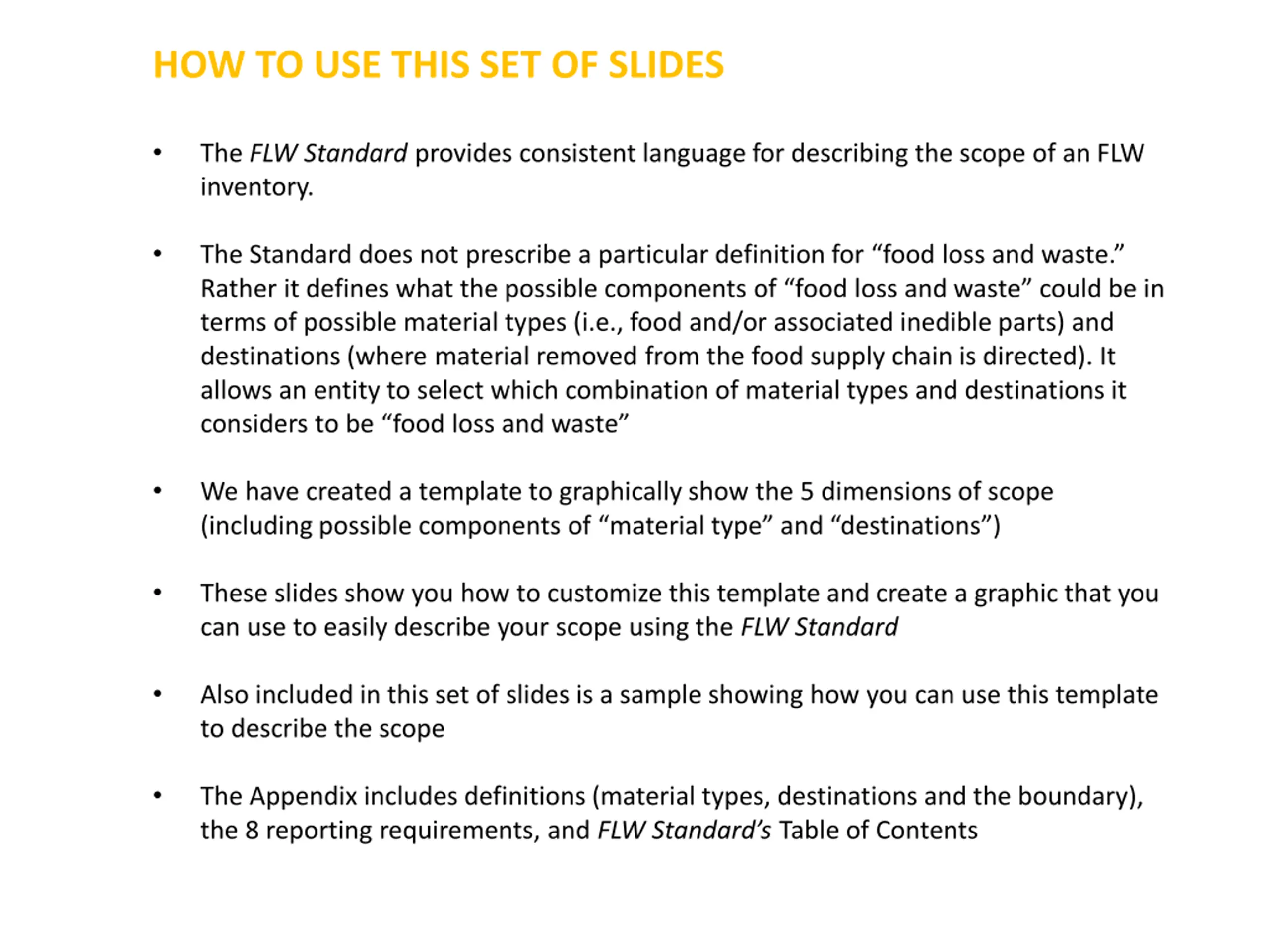 HOW TO USE THIS SET OF SLIDES The FLW Standard provides consistent language for describing the scope of an FLW inventory. The Standard does not prescribe a particular definition for food loss and waste. Rather it defines what the possible components of food loss and waste could be in terms of possible material types (i.e., food and/or associated inedible parts) and destinations (where material removed from the food supply chain is directed). It allows an entity to select which combination of material types and destinations it considers to be food loss and waste We have created a template to graphically show the 5 dimensions of scope (including possible components of material type and destinations ) These slides show you how to customize this template and create a graphic that you can use to easily describe your scope using the FLW Standard Also included in this set of slides is a sample showing how you can use this template to describe the scope The Appendix includes definitions (material types, destinations and the boundary), the 8 reporting requirements, and FLW Standard s Table of Contents