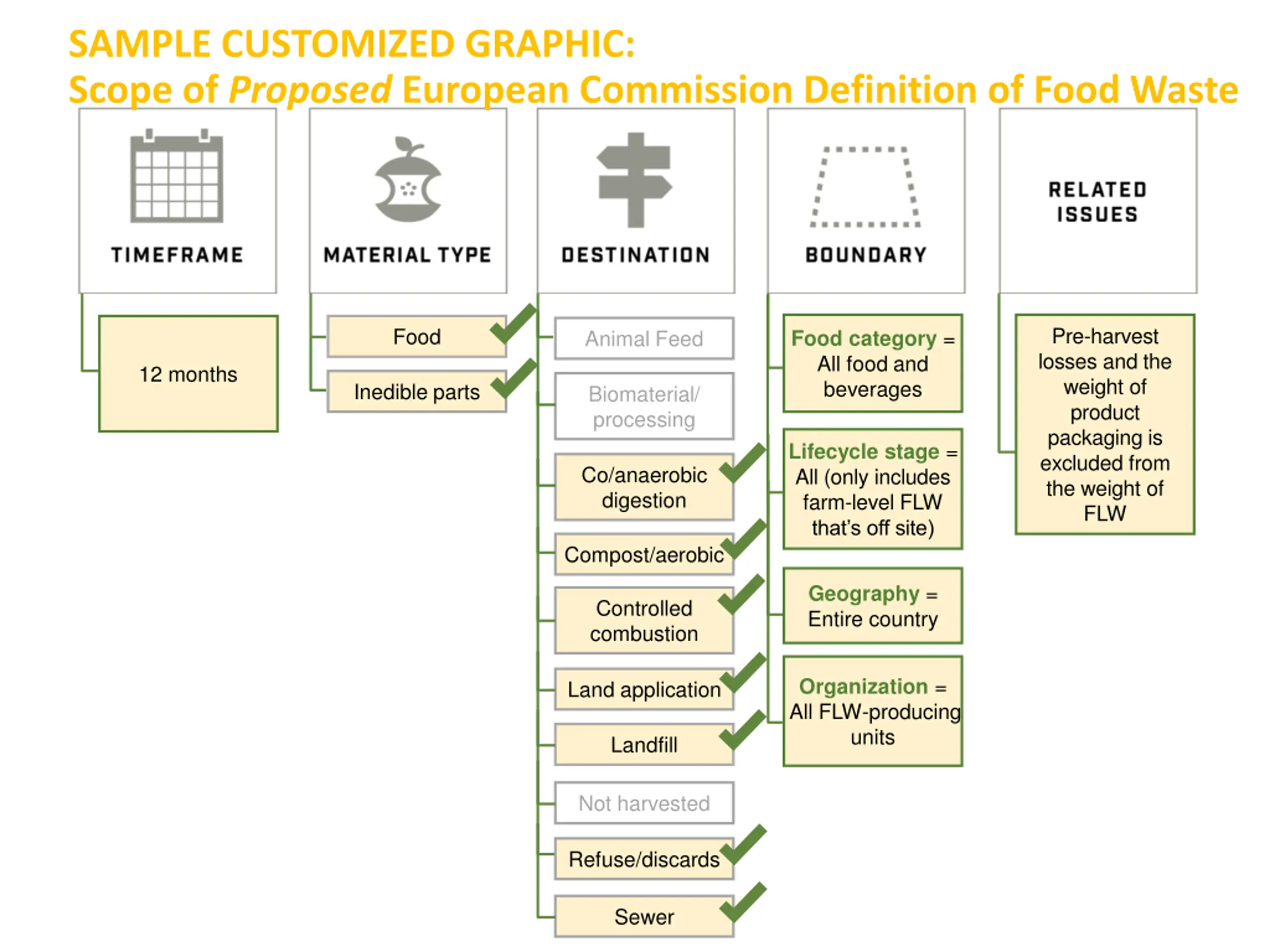 SAMPLE CUSTOMIZED GRAPHIC: Scope of Proposed European Commission Definition of Food Waste Pre-harvest losses and the weight of product packaging is excluded from the weight of FLW Food Food category = All food and beverages Animal Feed 12 months Inedible parts Biomaterial/ processing Lifecycle stage = All (only includes farm-level FLW that s off site) Co/anaerobic digestion Compost/aerobic Geography = Entire country Controlled combustion Organization = All FLW-producing units Land application Landfill Not harvested Refuse/discards Sewer