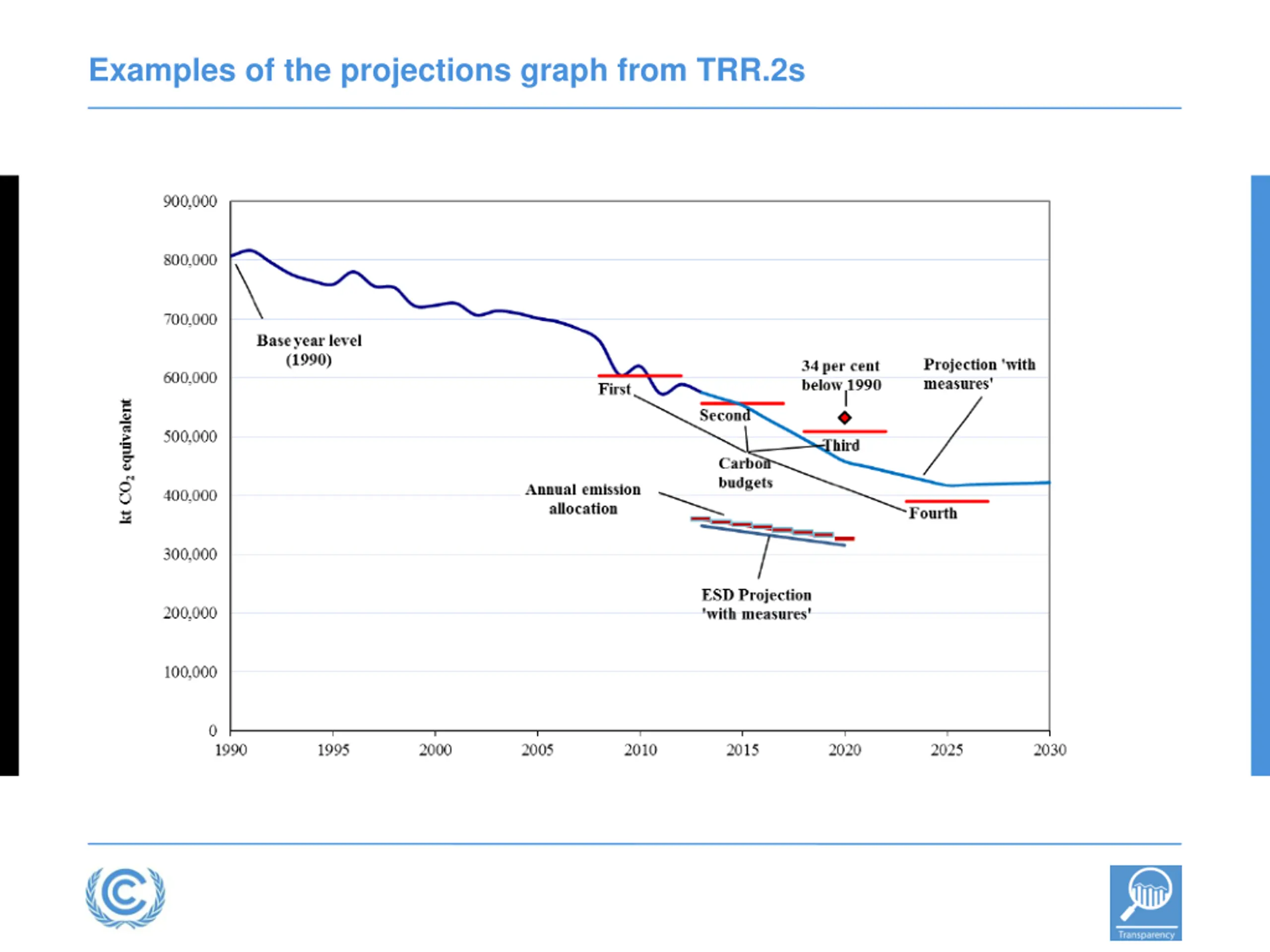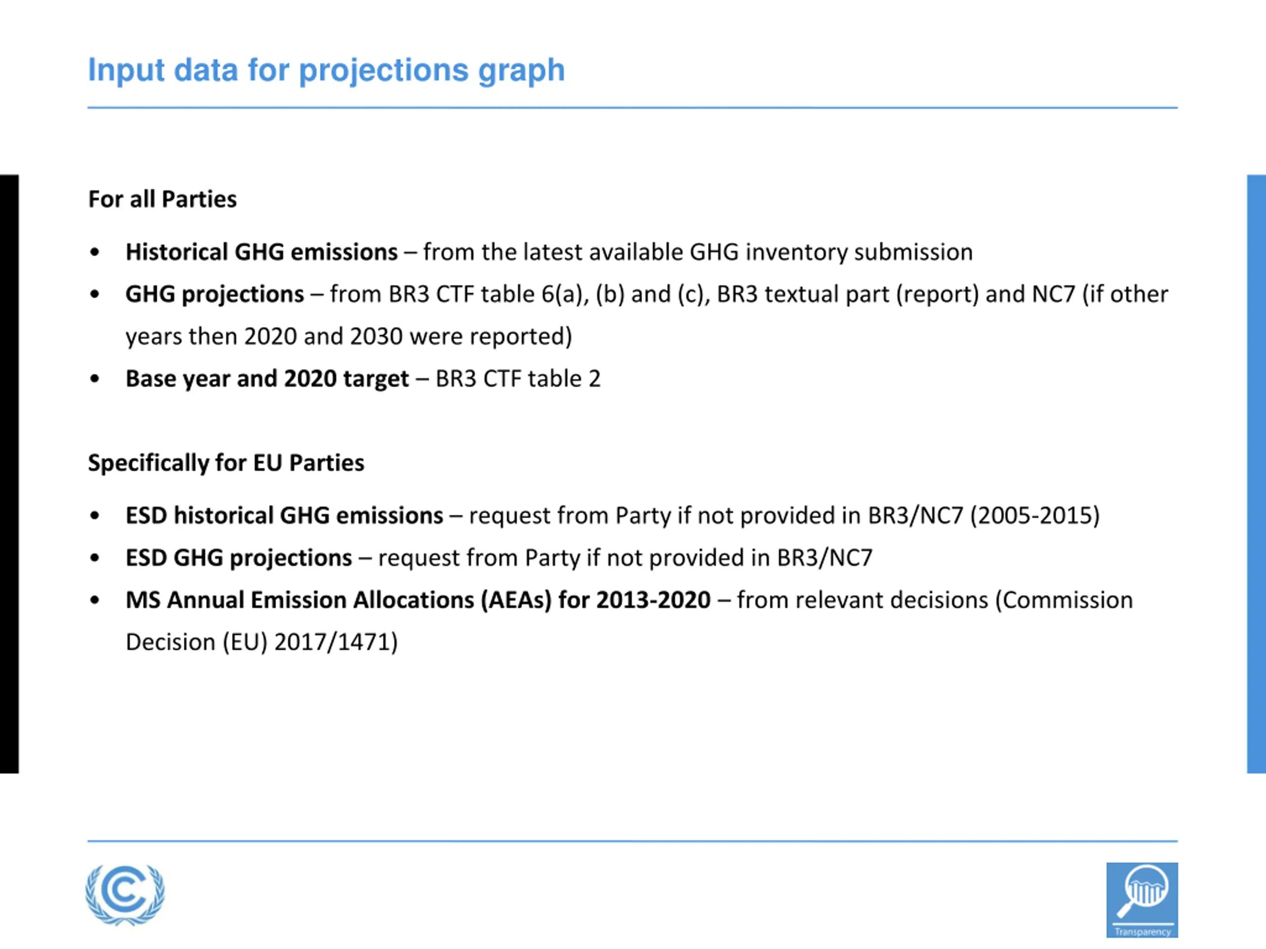 Input data for projections graph For all Parties Historical GHG emissions from the latest available GHG inventory submission GHG projections from BR3 CTF table 6(a), (b) and (c), BR3 textual part (report) and NC7 (if other years then 2020 and 2030 were reported) Base year and 2020 target BR3 CTF table 2 Specifically for EU Parties ESD historical GHG emissions request from Party if not provided in BR3/NC7 (2005-2015) ESD GHG projections request from Party if not provided in BR3/NC7 MS Annual Emission Allocations (AEAs) for 2013-2020 from relevant decisions (Commission Decision (EU) 2017/1471)