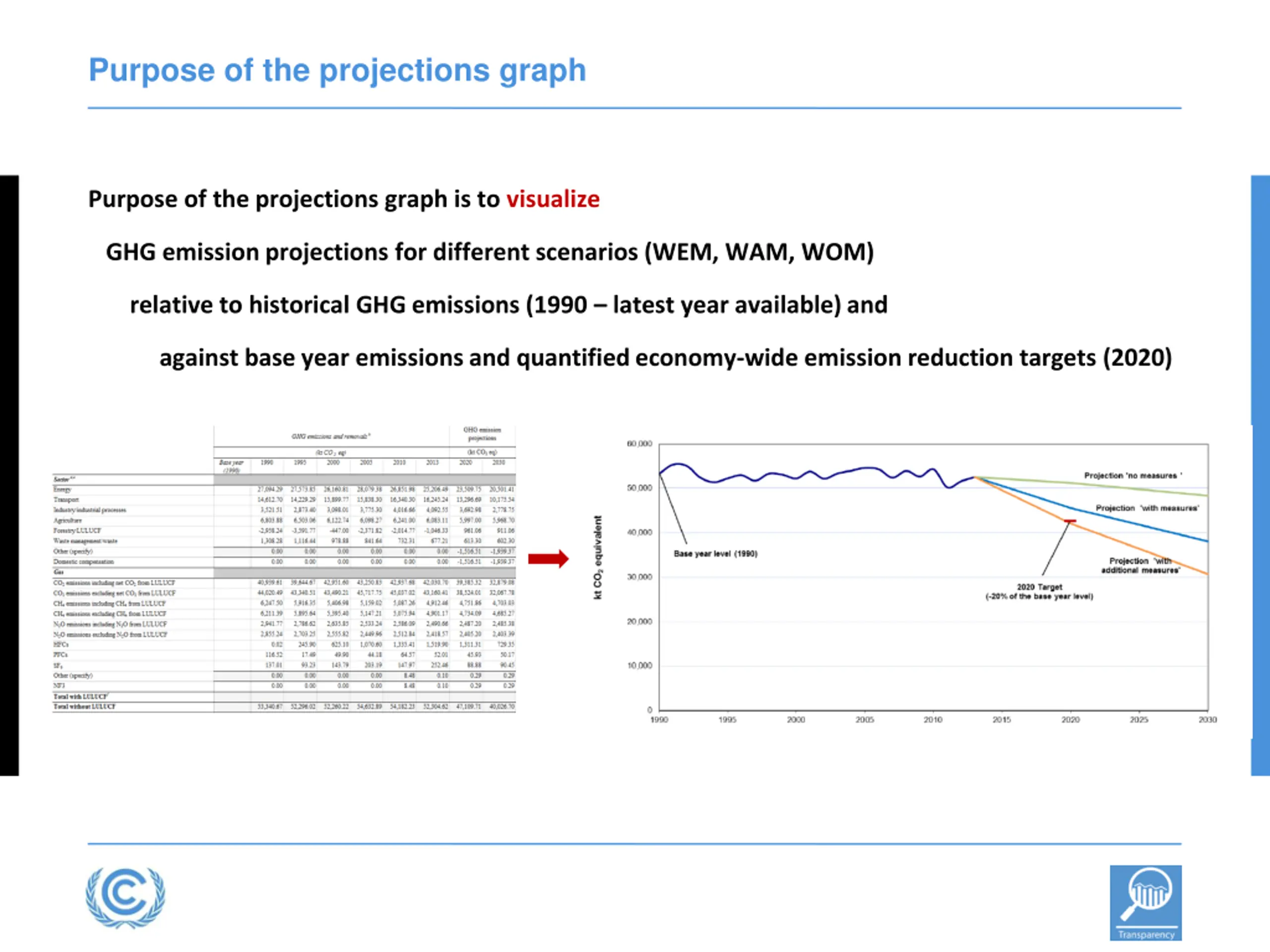 Purpose of the projections graph Purpose of the projections graph is to visualize GHG emission projections for different scenarios (WEM, WAM, WOM) relative to historical GHG emissions (1990 latest year available) and against base year emissions and quantified economy-wide emission reduction targets (2020)