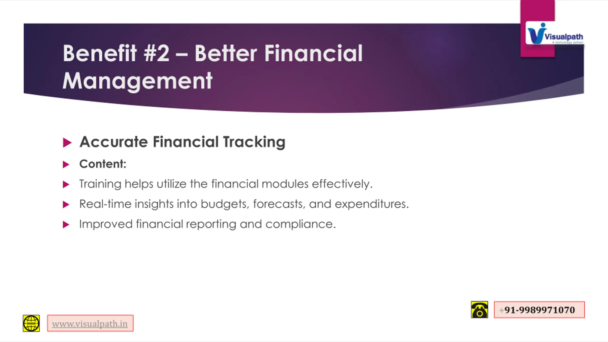 Benefit #2 Better Financial Management Accurate Financial Tracking Content: Training helps utilize the financial modules effectively. Real-time insights into budgets, forecasts, and expenditures. Improved financial reporting and compliance. +91-9989971070 www.visualpath.in