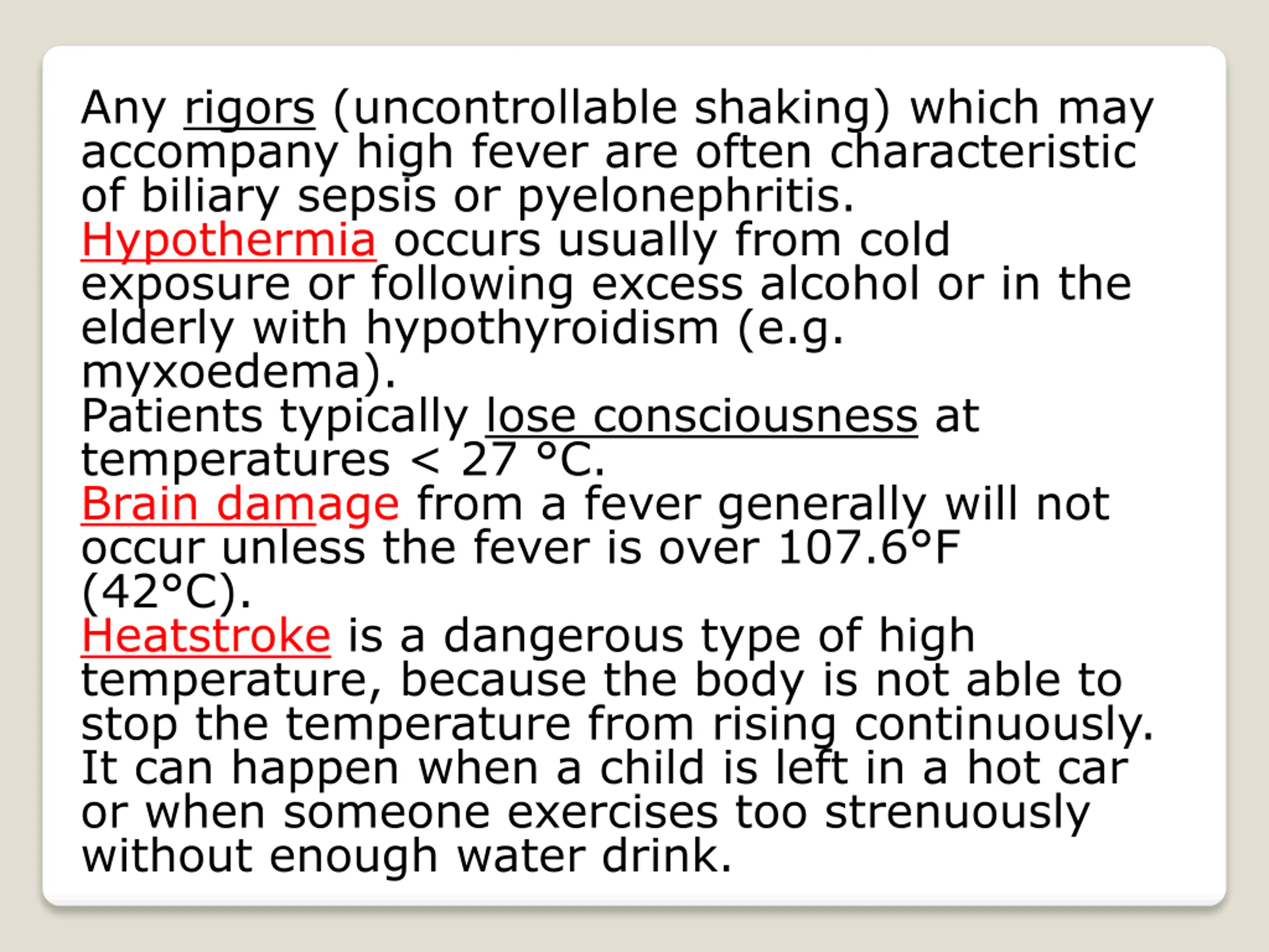 Any rigors (uncontrollable shaking) which may accompany high fever are often characteristic of biliary sepsis or pyelonephritis. Hypothermia occurs usually from cold exposure or following excess alcohol or in the elderly with hypothyroidism (e.g. myxoedema). Patients typically lose consciousness at temperatures < 27 C. Brain damage from a fever generally will not occur unless the fever is over 107.6 F (42 C). Heatstroke is a dangerous type of high temperature, because the body is not able to stop the temperature from rising continuously. It can happen when a child is left in a hot car or when someone exercises too strenuously without enough water drink.