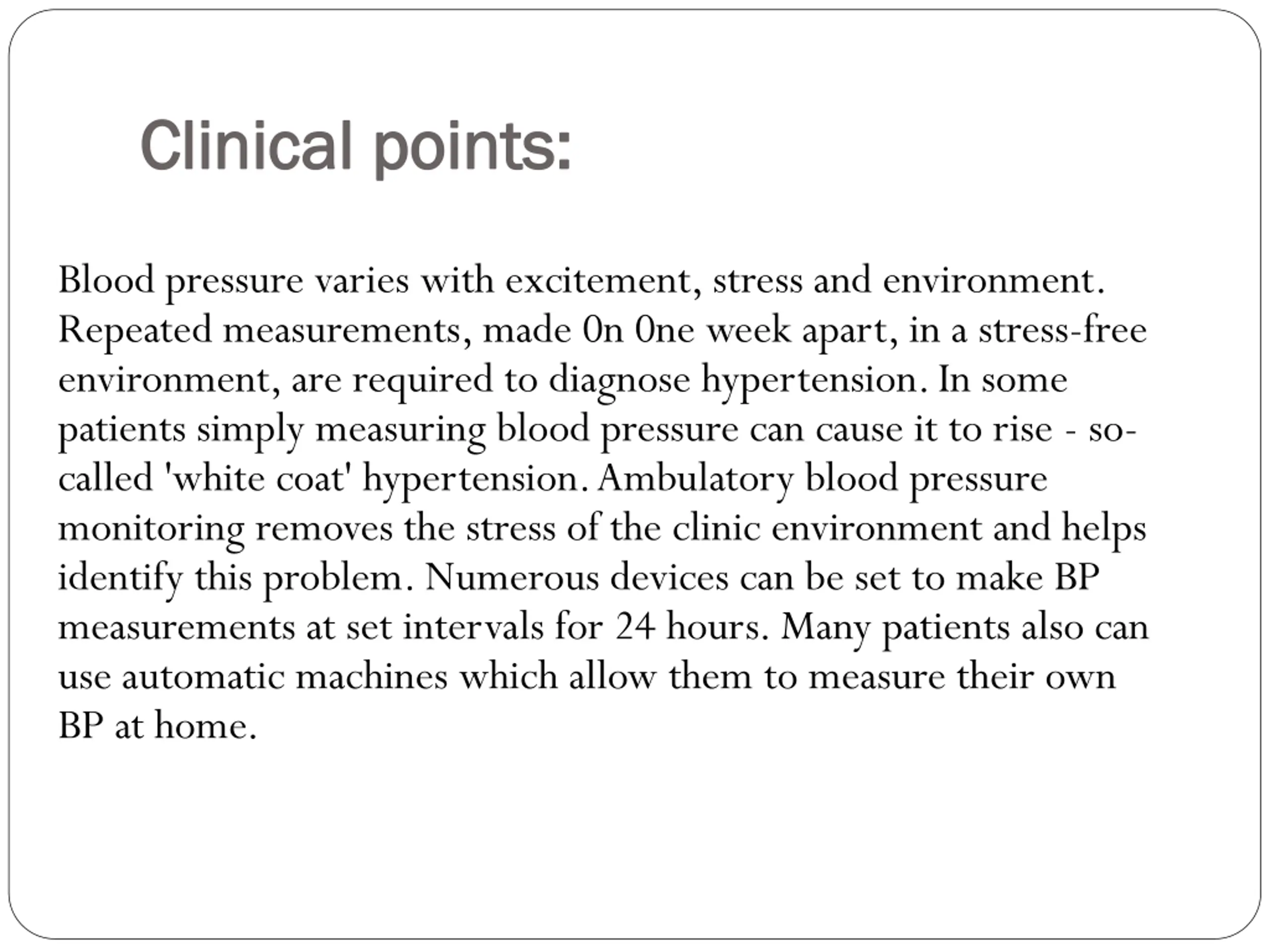 Clinical points: Clinical points: Blood pressure varies with excitement, stress and environment. Repeated measurements, made 0n 0ne week apart, in a stress-free environment, are required to diagnose hypertension. In some patients simply measuring blood pressure can cause it to rise - so- called 'white coat' hypertension. Ambulatory blood pressure monitoring removes the stress of the clinic environment and helps identify this problem. Numerous devices can be set to make BP measurements at set intervals for 24 hours. Many patients also can use automatic machines which allow them to measure their own BP at home.