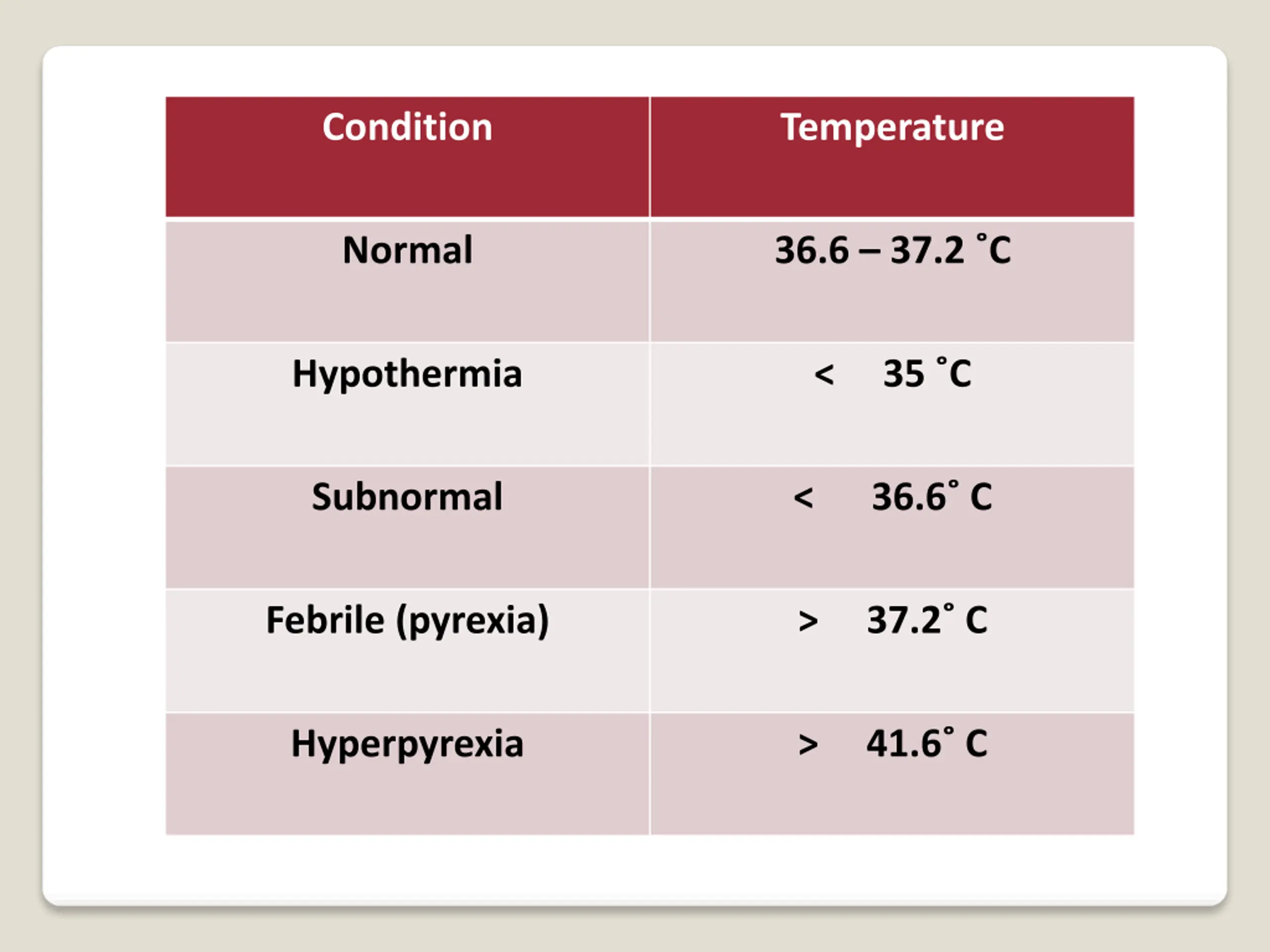 Condition Temperature Normal 36.6 37.2 C Hypothermia < 35 C Subnormal < 36.6 C Febrile (pyrexia) > 37.2 C Hyperpyrexia > 41.6 C