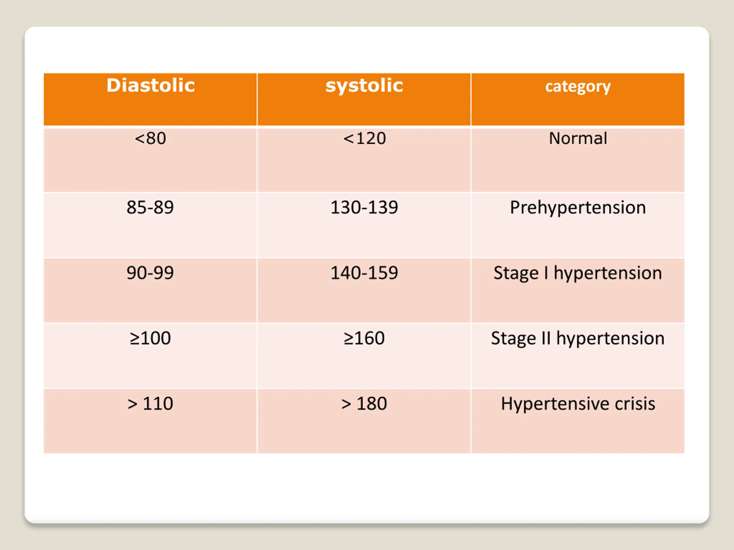 Diastolic systolic category 80 <120 Normal > 85-89 130-139 Prehypertension 90-99 140-159 Stage I hypertension 100 160 Stage II hypertension > 110 > 180 Hypertensive crisis