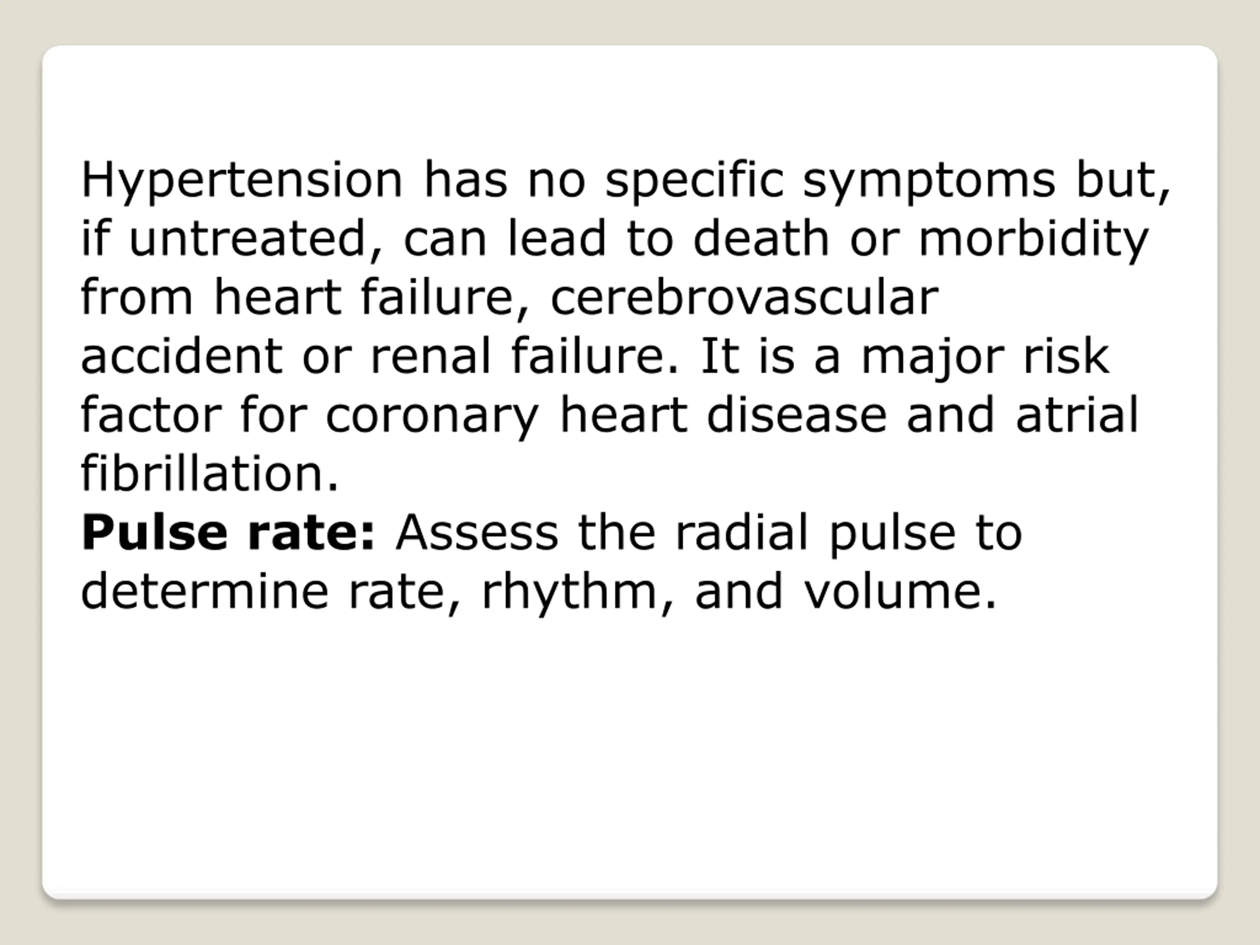 Hypertension has no specific symptoms but, if untreated, can lead to death or morbidity from heart failure, cerebrovascular accident or renal failure. It is a major risk factor for coronary heart disease and atrial fibrillation. Pulse rate: Assess the radial pulse to determine rate, rhythm, and volume.