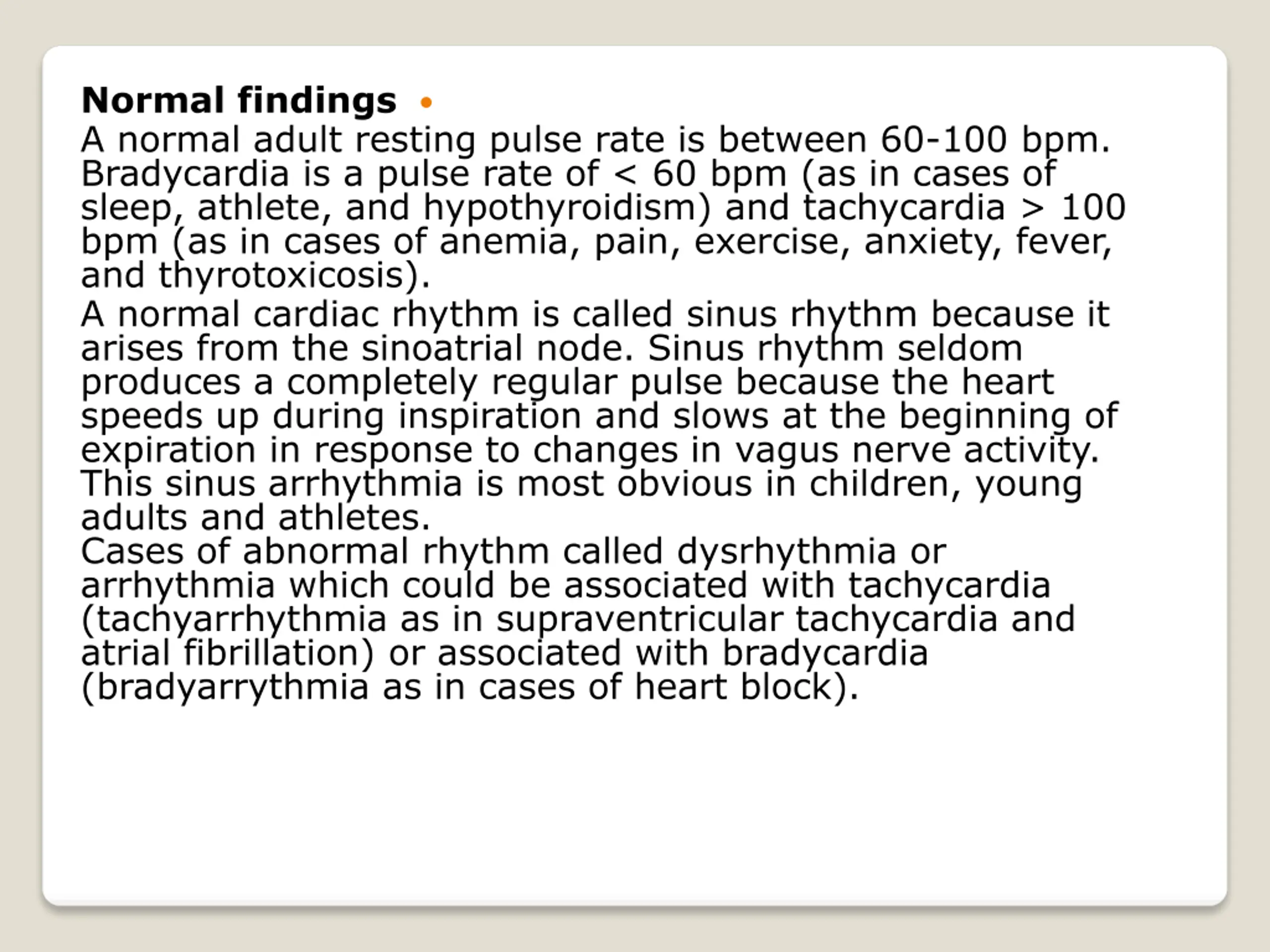 Normal findings A normal adult resting pulse rate is between 60-100 bpm. Bradycardia is a pulse rate of < 60 bpm (as in cases of sleep, athlete, and hypothyroidism) and tachycardia > 100 bpm (as in cases of anemia, pain, exercise, anxiety, fever, and thyrotoxicosis). A normal cardiac rhythm is called sinus rhythm because it arises from the sinoatrial node. Sinus rhythm seldom produces a completely regular pulse because the heart speeds up during inspiration and slows at the beginning of expiration in response to changes in vagus nerve activity. This sinus arrhythmia is most obvious in children, young adults and athletes. Cases of abnormal rhythm called dysrhythmia or arrhythmia which could be associated with tachycardia (tachyarrhythmia as in supraventricular tachycardia and atrial fibrillation) or associated with bradycardia (bradyarrythmia as in cases of heart block).