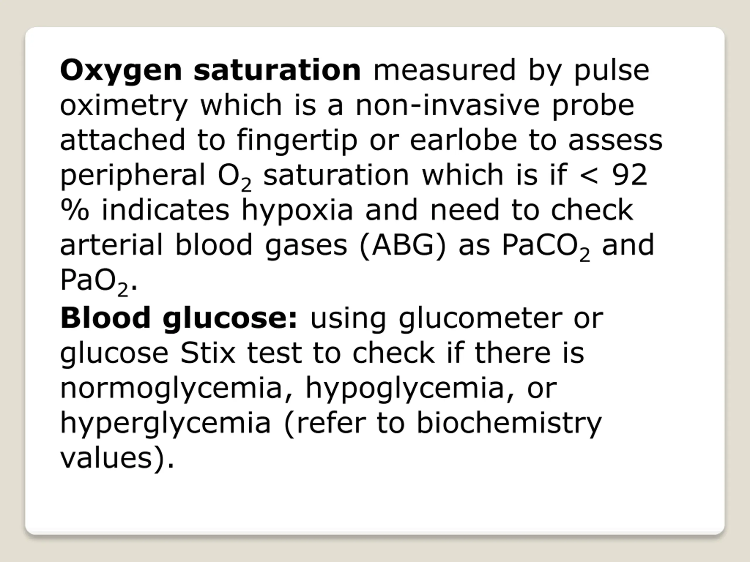 Oxygen saturation measured by pulse oximetry which is a non-invasive probe attached to fingertip or earlobe to assess peripheral O2saturation which is if < 92 % indicates hypoxia and need to check arterial blood gases (ABG) as PaCO2and PaO2. Blood glucose: using glucometer or glucose Stix test to check if there is normoglycemia, hypoglycemia, or hyperglycemia (refer to biochemistry values).