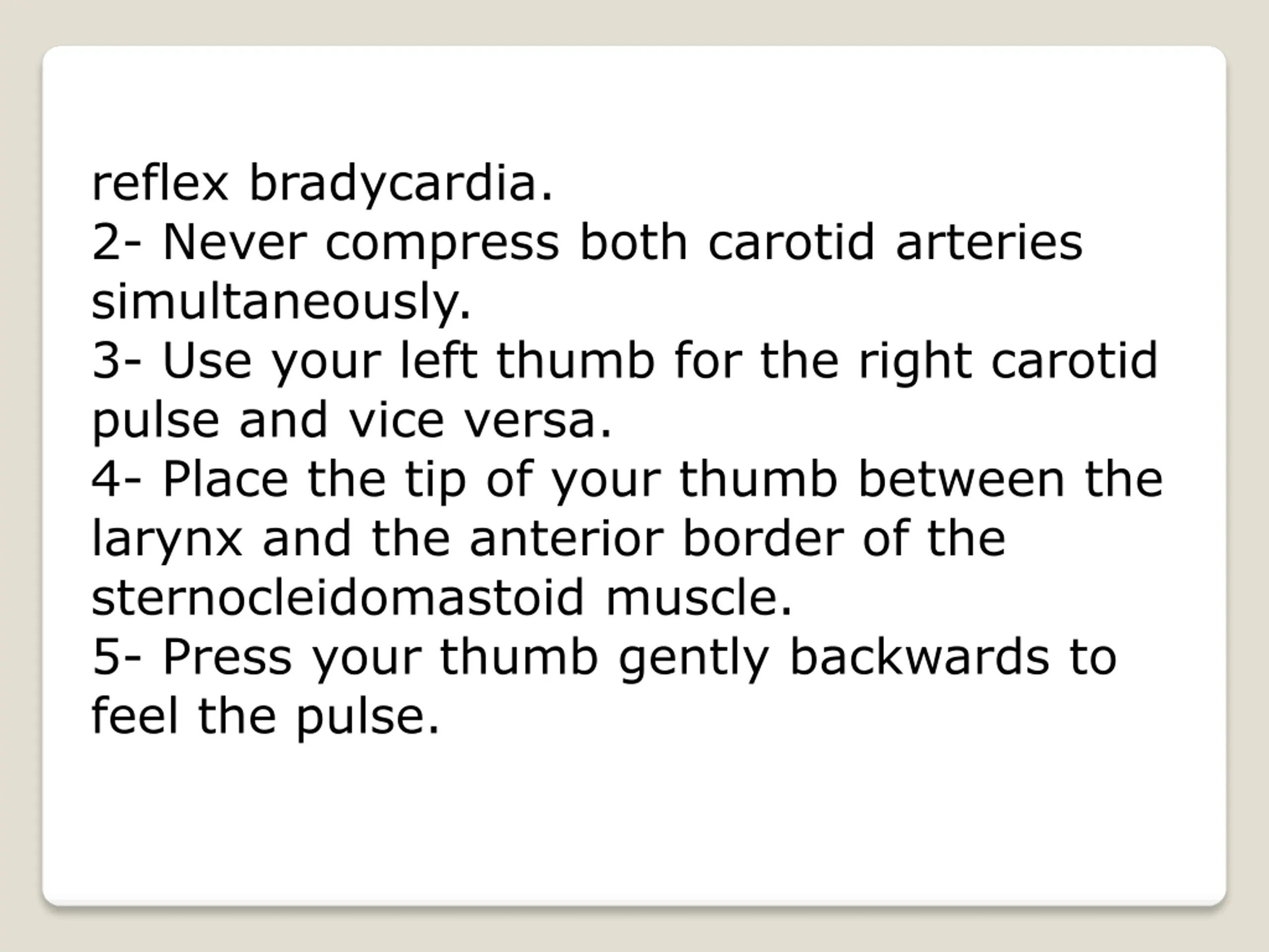 reflex bradycardia. 2- Never compress both carotid arteries simultaneously. 3- Use your left thumb for the right carotid pulse and vice versa. 4- Place the tip of your thumb between the larynx and the anterior border of the sternocleidomastoid muscle. 5- Press your thumb gently backwards to feel the pulse.