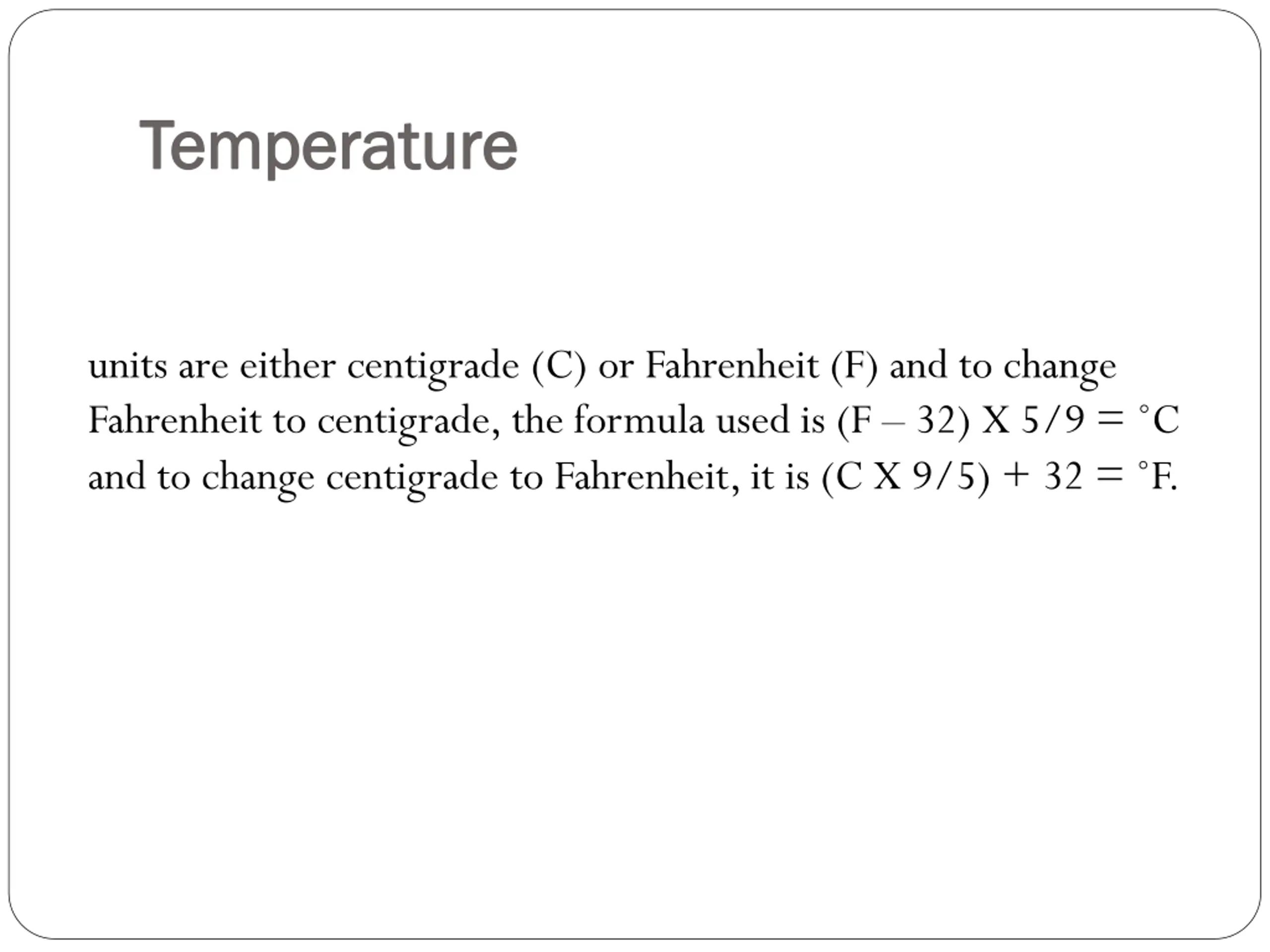 Temperature Temperature units are either centigrade (C) or Fahrenheit (F) and to change Fahrenheit to centigrade, the formula used is (F 32) X 5/9 = C and to change centigrade to Fahrenheit, it is (C X 9/5) + 32 = F.