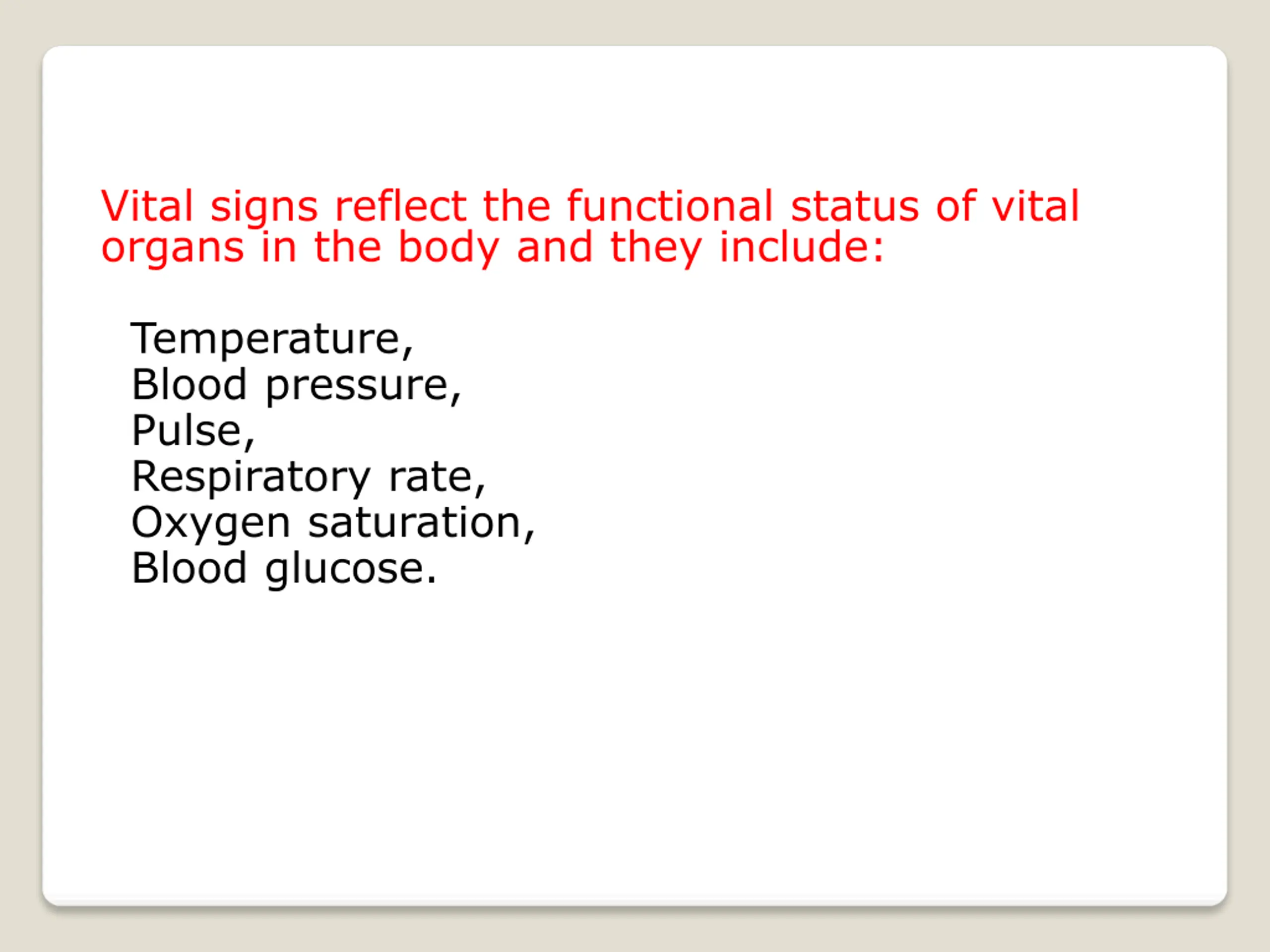 Vital signs reflect the functional status of vital organs in the body and they include: Temperature, Blood pressure, Pulse, Respiratory rate, Oxygen saturation, Blood glucose.