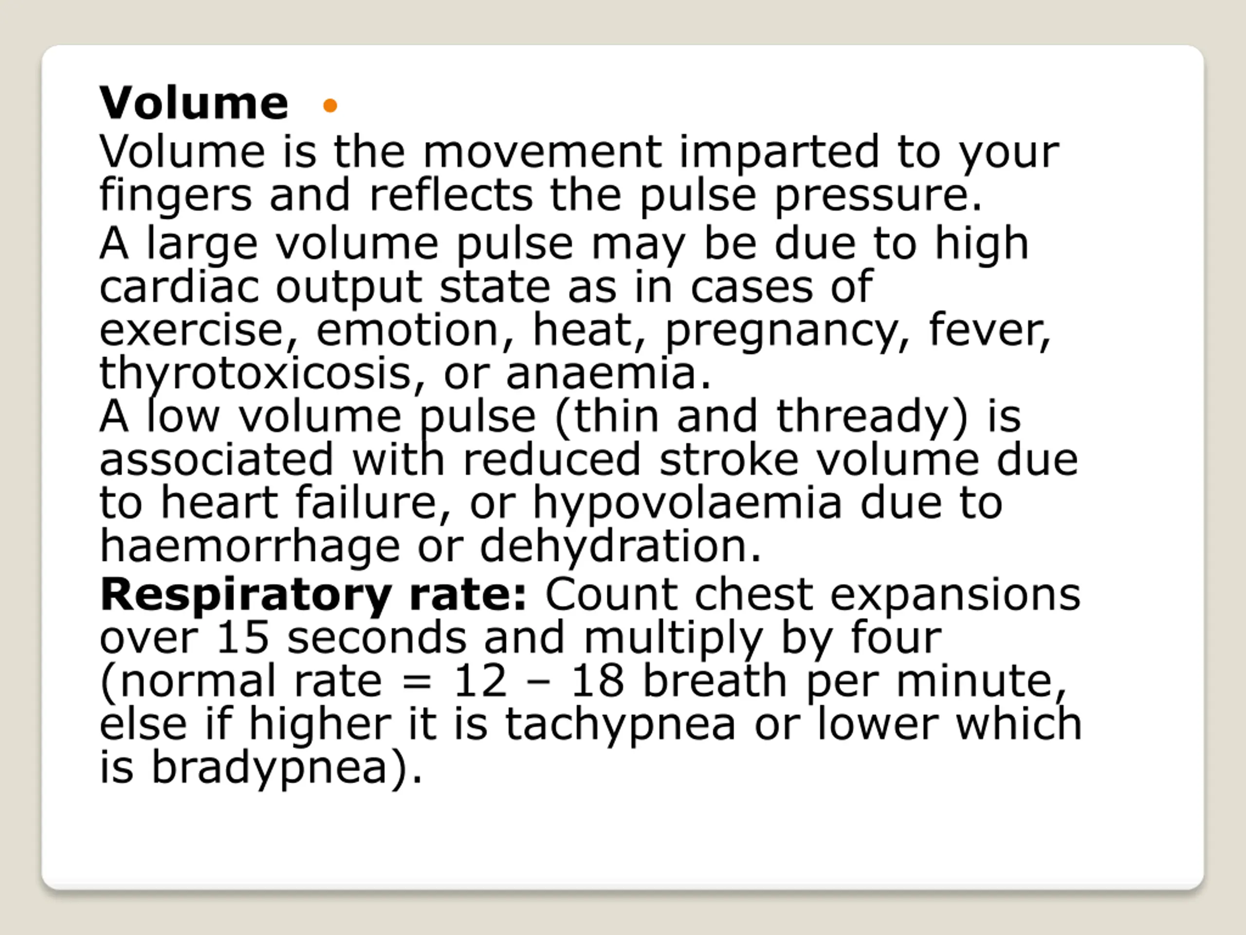 Volume Volume is the movement imparted to your fingers and reflects the pulse pressure. A large volume pulse may be due to high cardiac output state as in cases of exercise, emotion, heat, pregnancy, fever, thyrotoxicosis, or anaemia. A low volume pulse (thin and thready) is associated with reduced stroke volume due to heart failure, or hypovolaemia due to haemorrhage or dehydration. Respiratory rate: Count chest expansions over 15 seconds and multiply by four (normal rate = 12 18 breath per minute, else if higher it is tachypnea or lower which is bradypnea).
