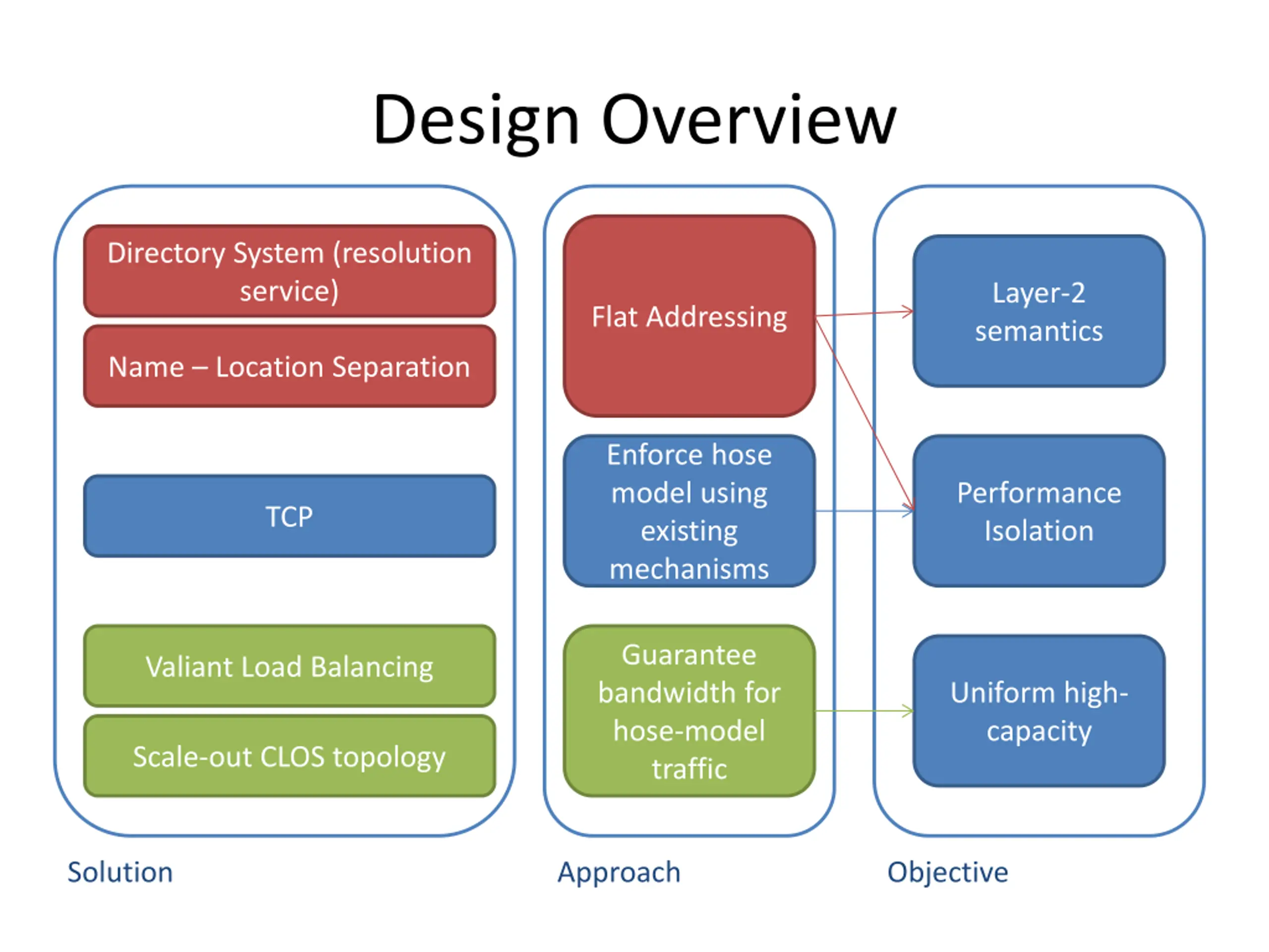 Design Overview Directory System (resolution service) Layer-2 semantics Flat Addressing Name Location Separation Enforce hose model using existing mechanisms Performance Isolation TCP Guarantee bandwidth for hose-model traffic Valiant Load Balancing Uniform high- capacity Scale-out CLOS topology Solution Approach Objective