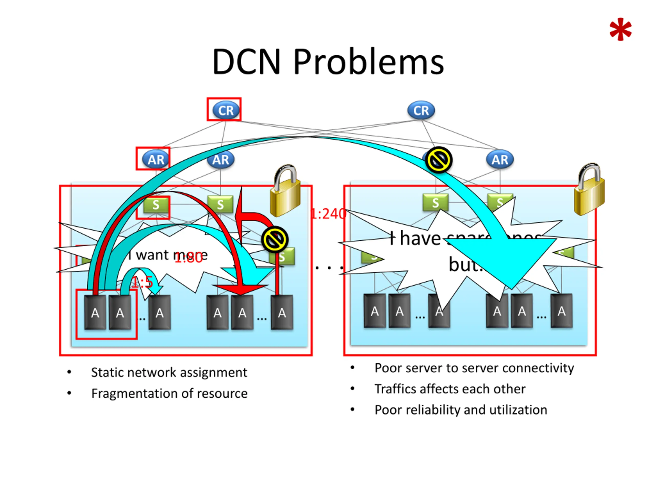 * DCN Problems CR CR AR AR AR AR S S S S 1:240 I have spare ones, but I want more S S S S 1:80 . . . S S S S 1:5 Poor server to server connectivity Traffics affects each other Poor reliability and utilization Static network assignment Fragmentation of resource