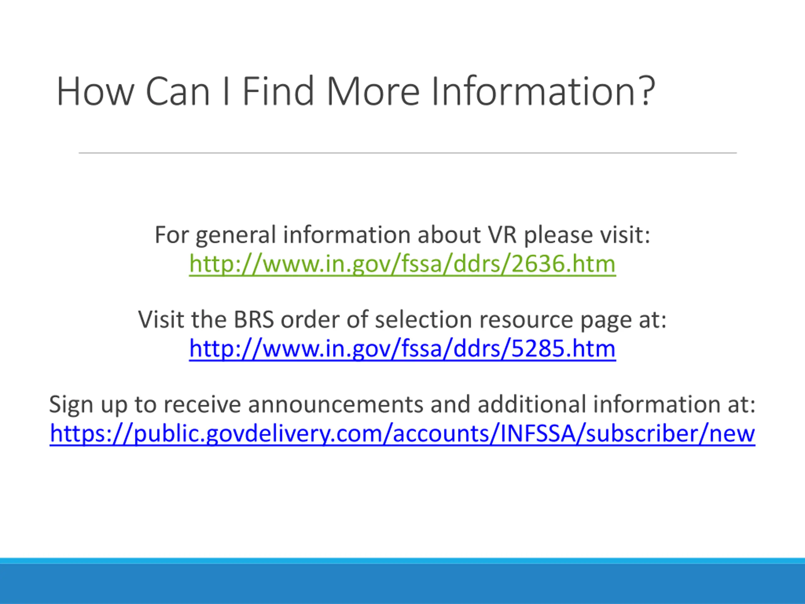 How Can I Find More Information? For general information about VR please visit: http://www.in.gov/fssa/ddrs/2636.htm Visit the BRS order of selection resource page at: http://www.in.gov/fssa/ddrs/5285.htm Sign up to receive announcements and additional information at: https://public.govdelivery.com/accounts/INFSSA/subscriber/new