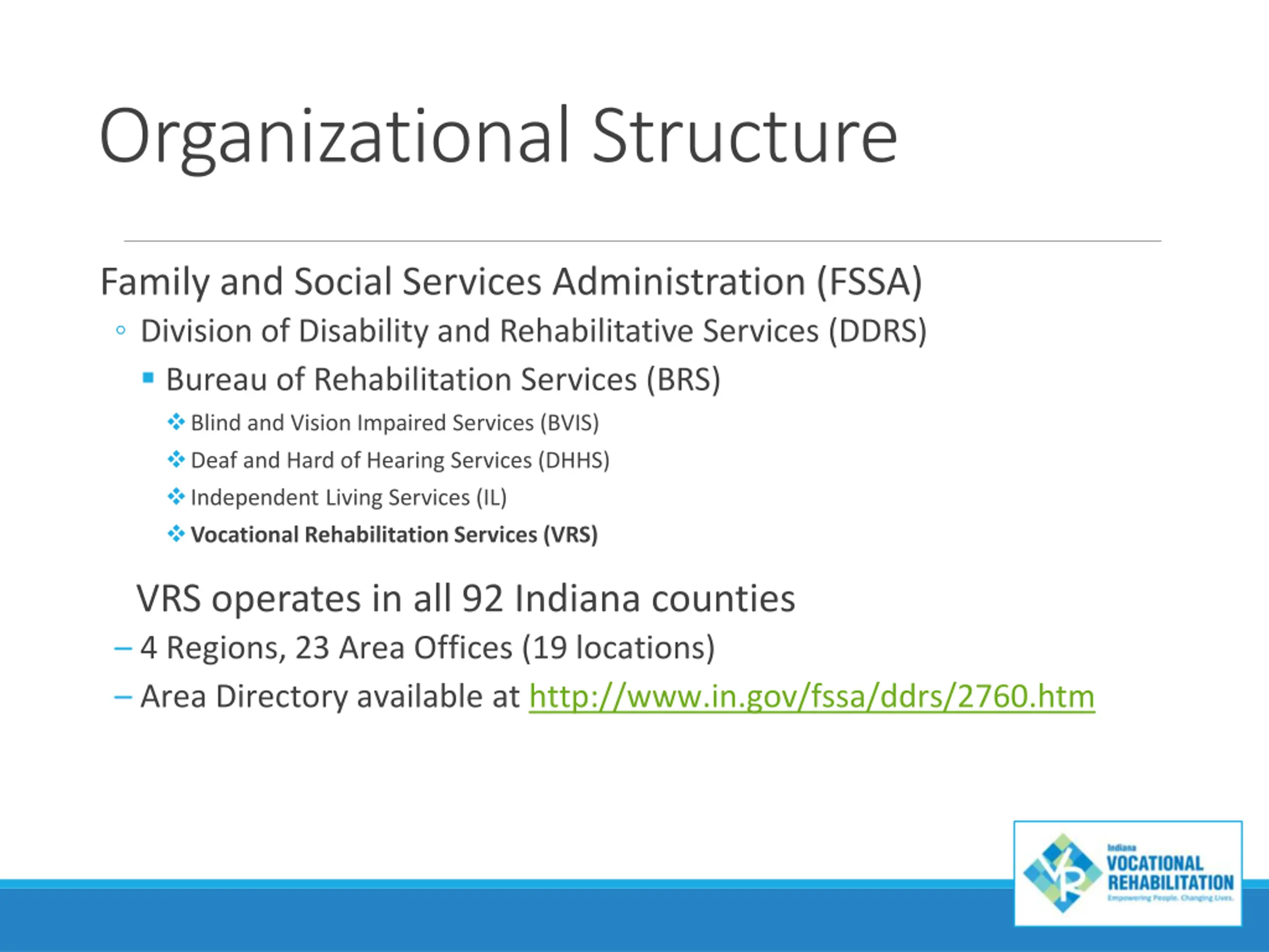 Organizational Structure Family and Social Services Administration (FSSA) Division of Disability and Rehabilitative Services (DDRS) Bureau of Rehabilitation Services (BRS) Blind and Vision Impaired Services (BVIS) Deaf and Hard of Hearing Services (DHHS) Independent Living Services (IL) Vocational Rehabilitation Services (VRS) VRS operates in all 92 Indiana counties 4 Regions, 23 Area Offices (19 locations) Area Directory available at http://www.in.gov/fssa/ddrs/2760.htm
