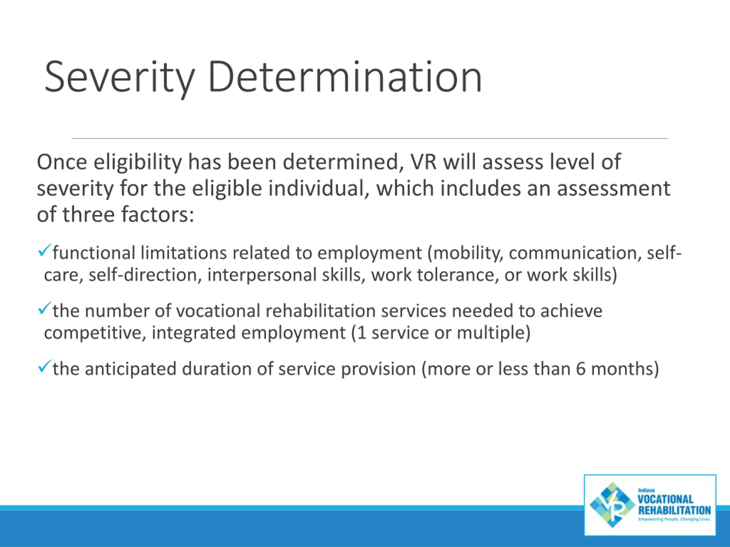 Severity Determination Once eligibility has been determined, VR will assess level of severity for the eligible individual, which includes an assessment of three factors: functional limitations related to employment (mobility, communication, self- care, self-direction, interpersonal skills, work tolerance, or work skills) the number of vocational rehabilitation services needed to achieve competitive, integrated employment (1 service or multiple) the anticipated duration of service provision (more or less than 6 months)