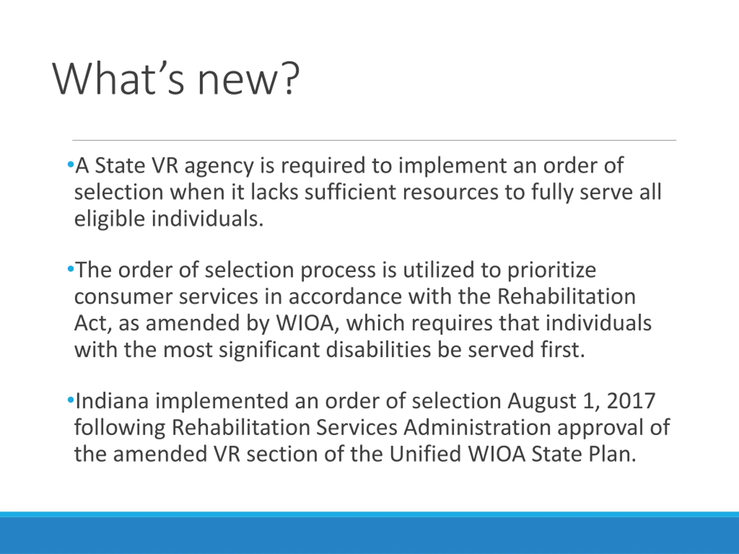 Whats new? A State VR agency is required to implement an order of selection when it lacks sufficient resources to fully serve all eligible individuals. The order of selection process is utilized to prioritize consumer services in accordance with the Rehabilitation Act, as amended by WIOA, which requires that individuals with the most significant disabilities be served first. Indiana implemented an order of selection August 1, 2017 following Rehabilitation Services Administration approval of the amended VR section of the Unified WIOA State Plan.