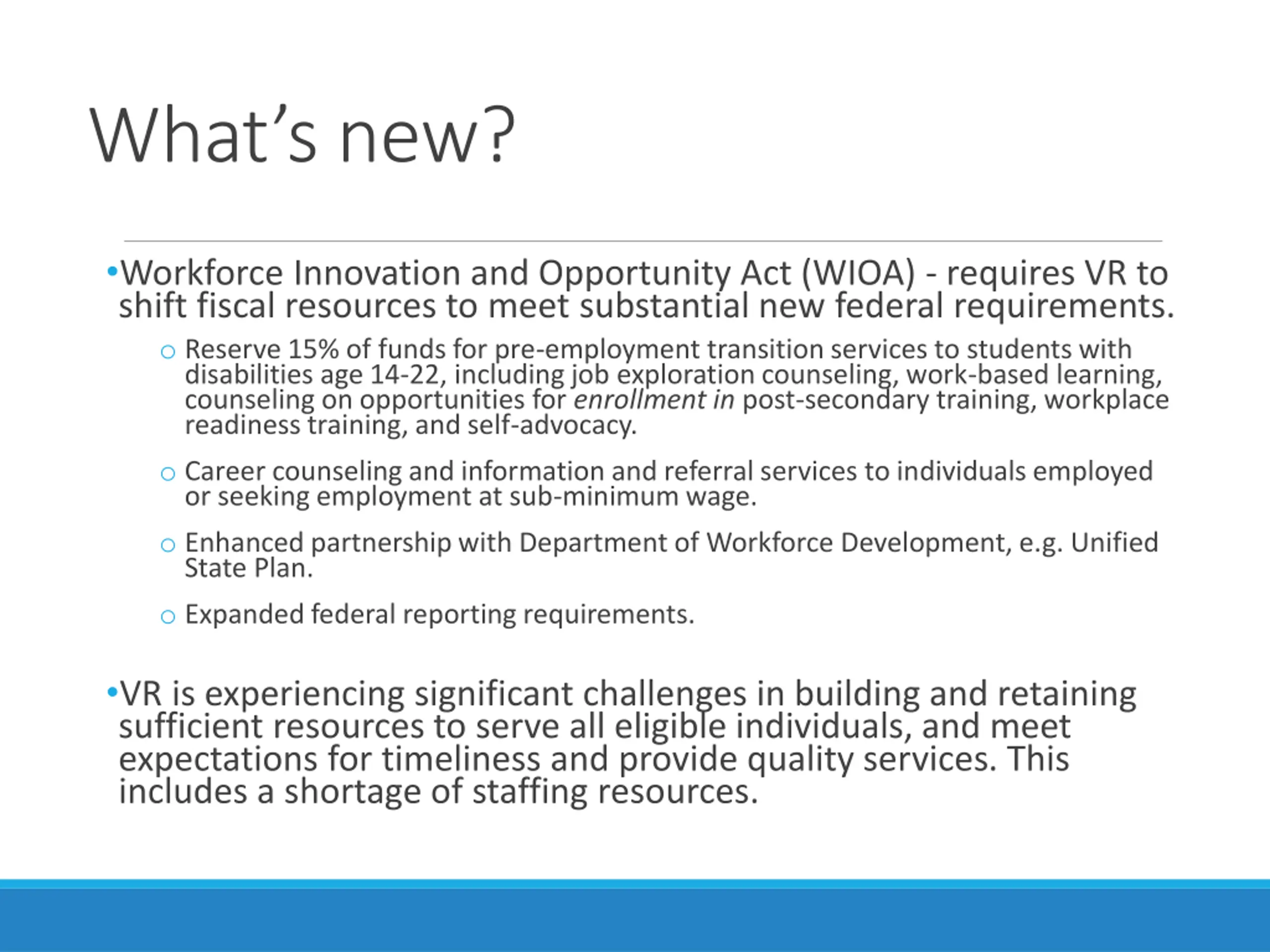 Whats new? Workforce Innovation and Opportunity Act (WIOA) - requires VR to shift fiscal resources to meet substantial new federal requirements. o Reserve 15% of funds for pre-employment transition services to students with disabilities age 14-22, including job exploration counseling, work-based learning, counseling on opportunities for enrollment in post-secondary training, workplace readiness training, and self-advocacy. o Career counseling and information and referral services to individuals employed or seeking employment at sub-minimum wage. o Enhanced partnership with Department of Workforce Development, e.g. Unified State Plan. o Expanded federal reporting requirements. VR is experiencing significant challenges in building and retaining sufficient resources to serve all eligible individuals, and meet expectations for timeliness and provide quality services. This includes a shortage of staffing resources.