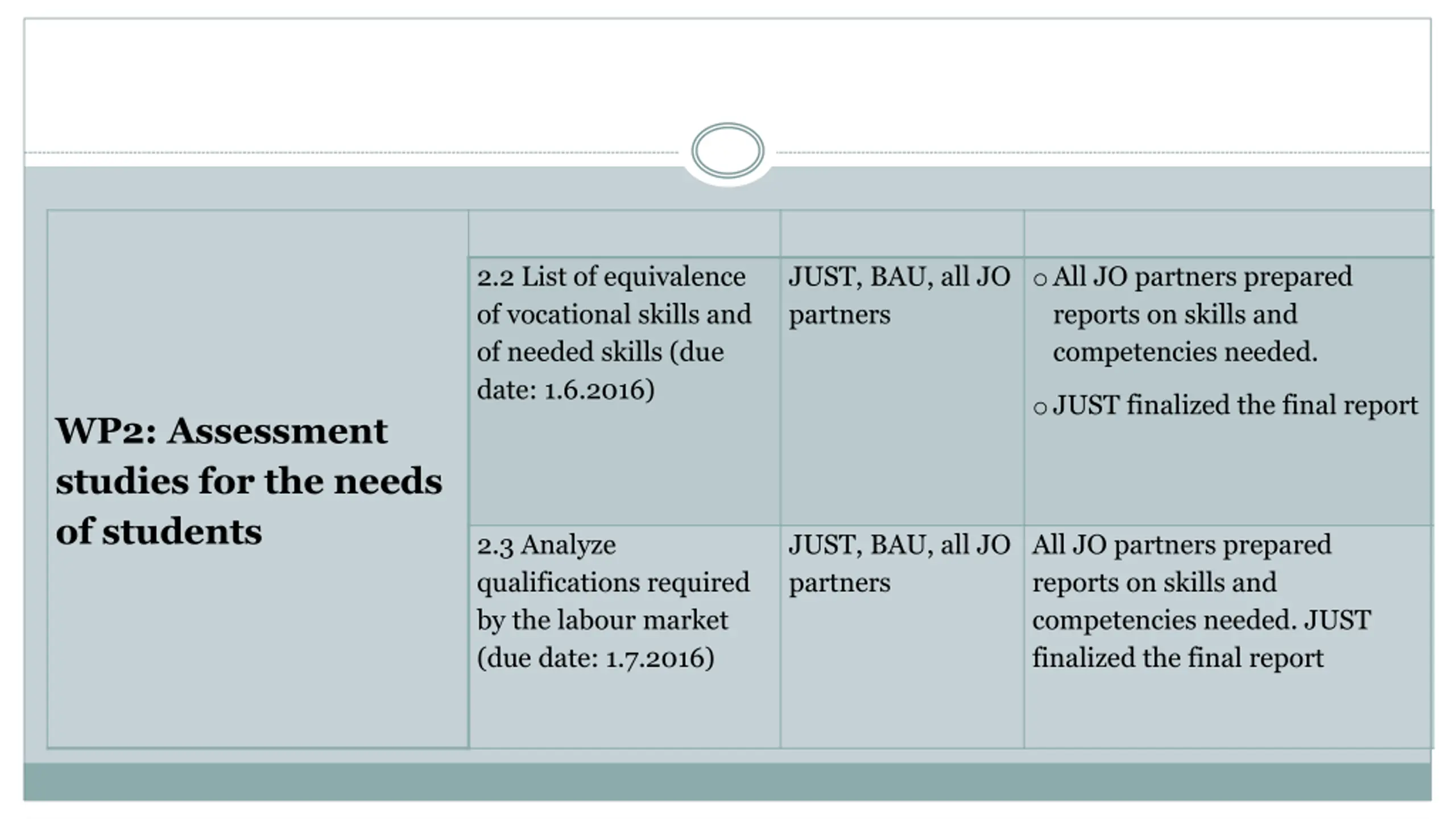 2.2 List of equivalence of vocational skills and of needed skills (due date: 1.6.2016) JUST, BAU, all JO partners oAll JO partners prepared reports on skills and competencies needed. oJUST finalized the final report WP2: Assessment studies for the needs of students 2.3 Analyze qualifications required by the labour market (due date: 1.7.2016) JUST, BAU, all JO partners All JO partners prepared reports on skills and competencies needed. JUST finalized the final report