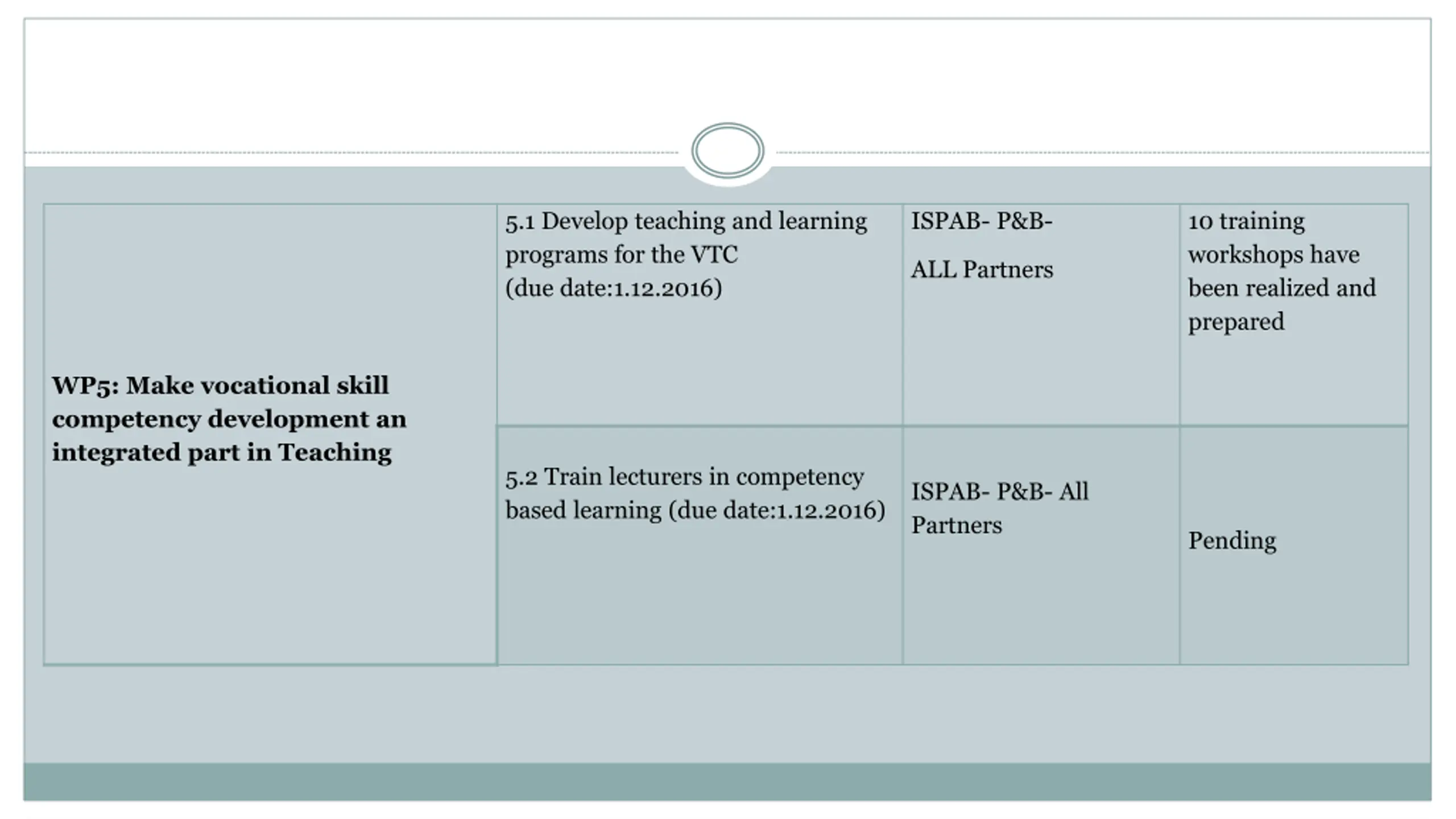 5.1 Develop teaching and learning programs for the VTC (due date:1.12.2016) ISPAB- P&B- 10 training workshops have been realized and prepared ALL Partners WP5: Make vocational skill competency development an integrated part in Teaching 5.2 Train lecturers in competency based learning (due date:1.12.2016) ISPAB- P&B- All Partners Pending