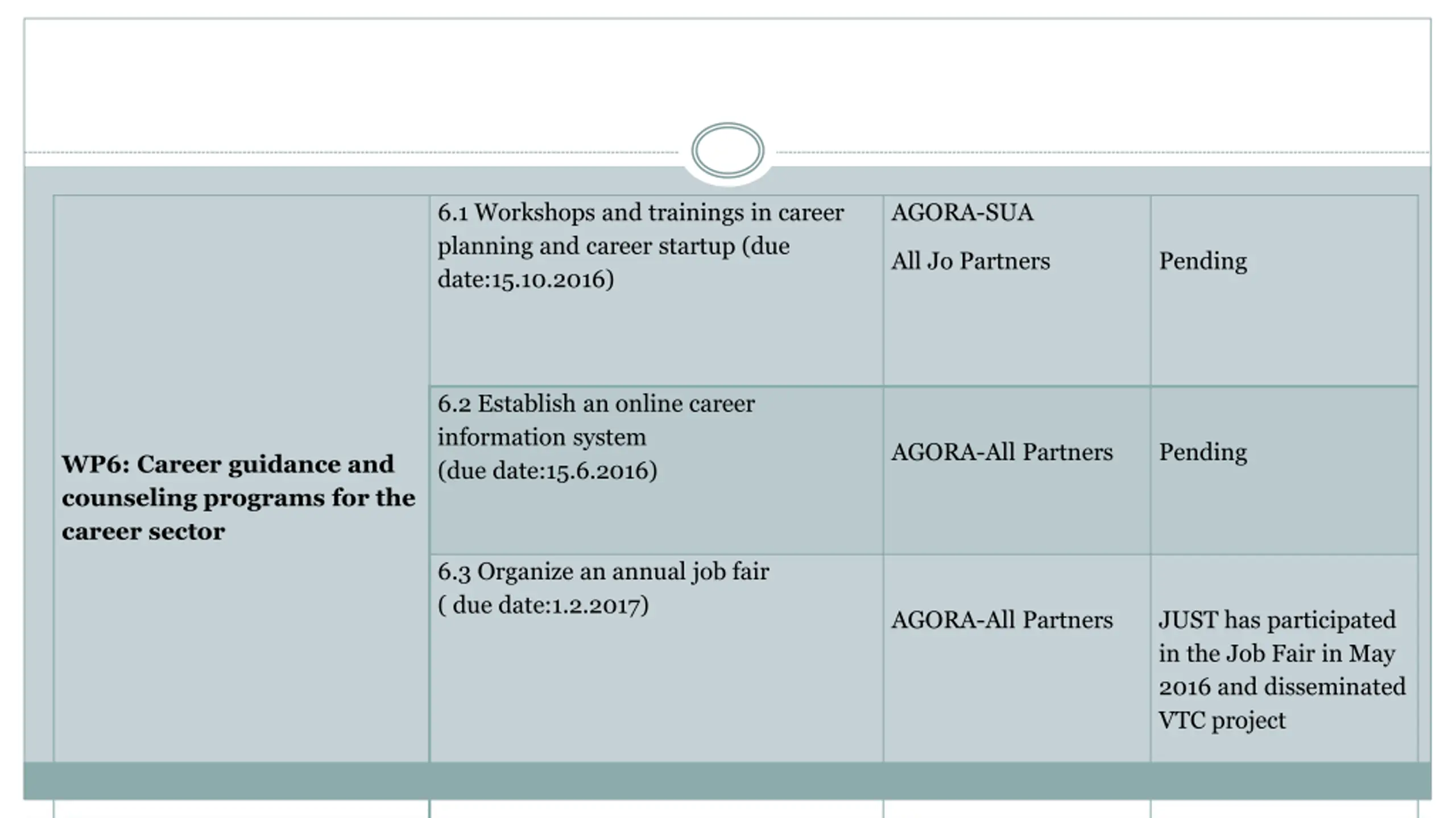 6.1 Workshops and trainings in career planning and career startup (due date:15.10.2016) AGORA-SUA All Jo Partners Pending 6.2 Establish an online career information system (due date:15.6.2016) AGORA-All Partners Pending WP6: Career guidance and counseling programs for the career sector 6.3 Organize an annual job fair ( due date:1.2.2017) AGORA-All Partners JUST has participated in the Job Fair in May 2016 and disseminated VTC project