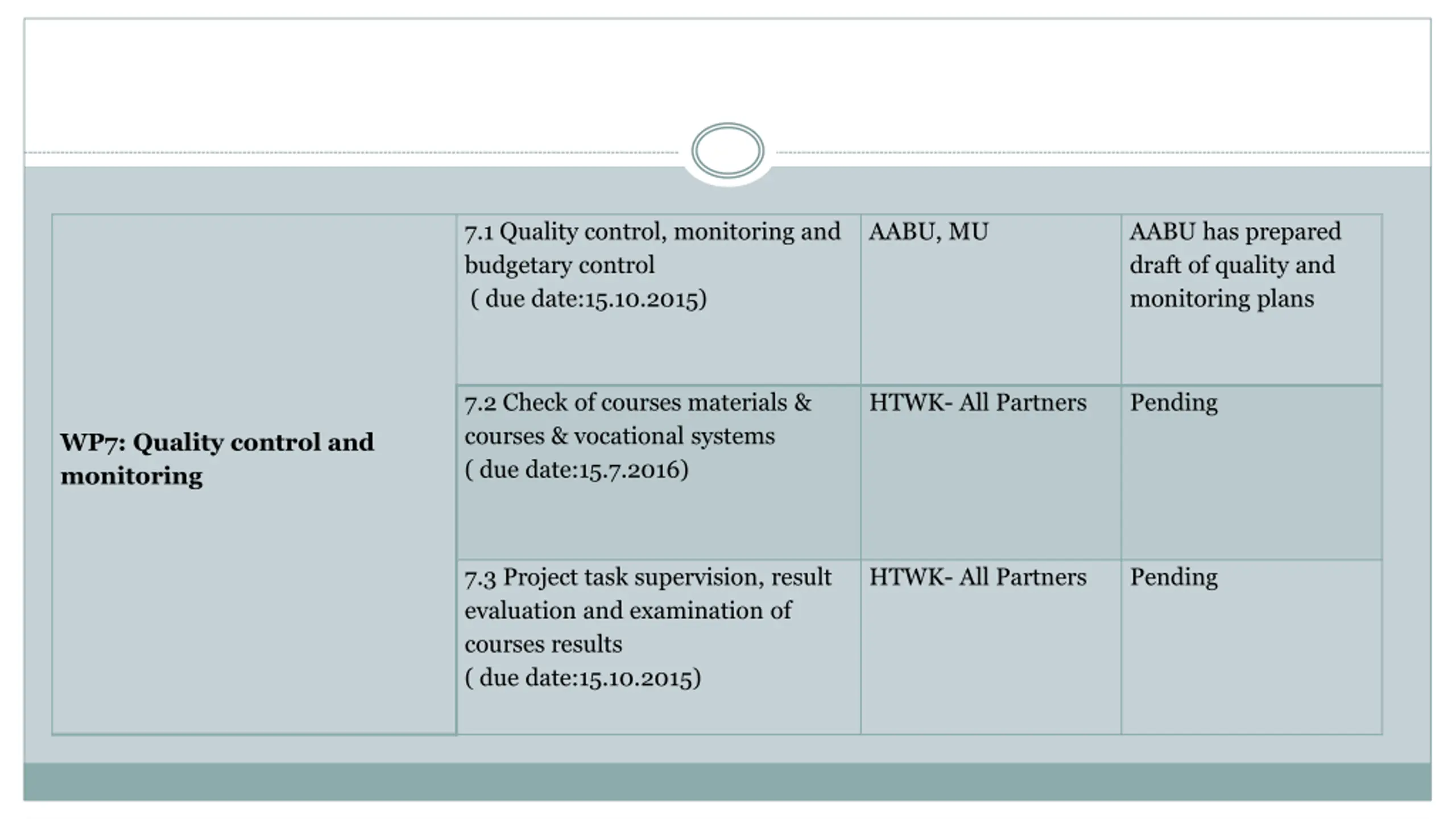 7.1 Quality control, monitoring and budgetary control ( due date:15.10.2015) AABU, MU AABU has prepared draft of quality and monitoring plans 7.2 Check of courses materials & courses & vocational systems ( due date:15.7.2016) HTWK- All Partners Pending WP7: Quality control and monitoring 7.3 Project task supervision, result evaluation and examination of courses results ( due date:15.10.2015) HTWK- All Partners Pending