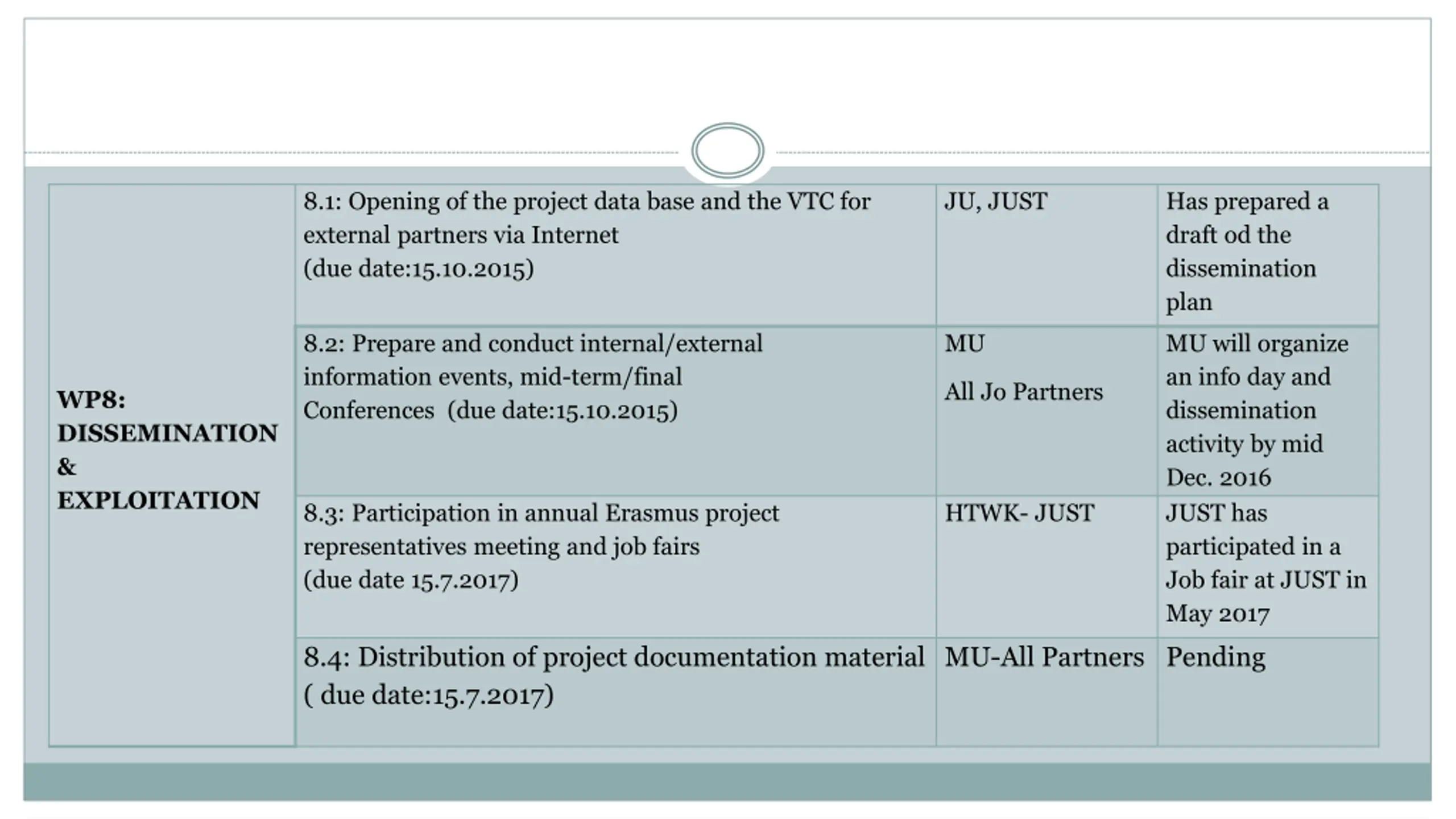 8.1: Opening of the project data base and the VTC for external partners via Internet (due date:15.10.2015) JU, JUST Has prepared a draft od the dissemination plan 8.2: Prepare and conduct internal/external information events, mid-term/final Conferences (due date:15.10.2015) MU MU will organize an info day and dissemination activity by mid Dec. 2016 JUST has participated in a Job fair at JUST in May 2017 All Jo Partners WP8: DISSEMINATION & EXPLOITATION 8.3: Participation in annual Erasmus project representatives meeting and job fairs (due date 15.7.2017) HTWK- JUST 8.4: Distribution of project documentation material ( due date:15.7.2017) MU-All Partners Pending