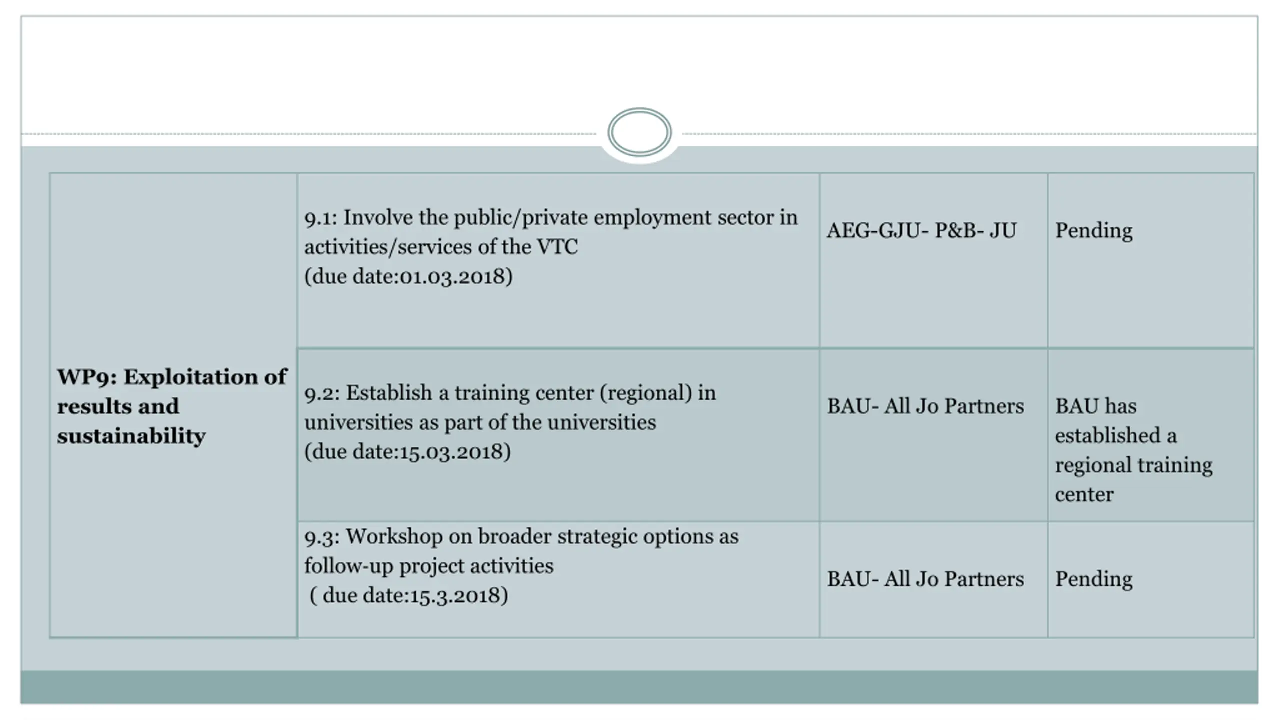 9.1: Involve the public/private employment sector in activities/services of the VTC (due date:01.03.2018) AEG-GJU- P&B- JU Pending WP9: Exploitation of results and sustainability 9.2: Establish a training center (regional) in universities as part of the universities (due date:15.03.2018) BAU- All Jo Partners BAU has established a regional training center 9.3: Workshop on broader strategic options as follow up project activities ( due date:15.3.2018) BAU- All Jo Partners Pending
